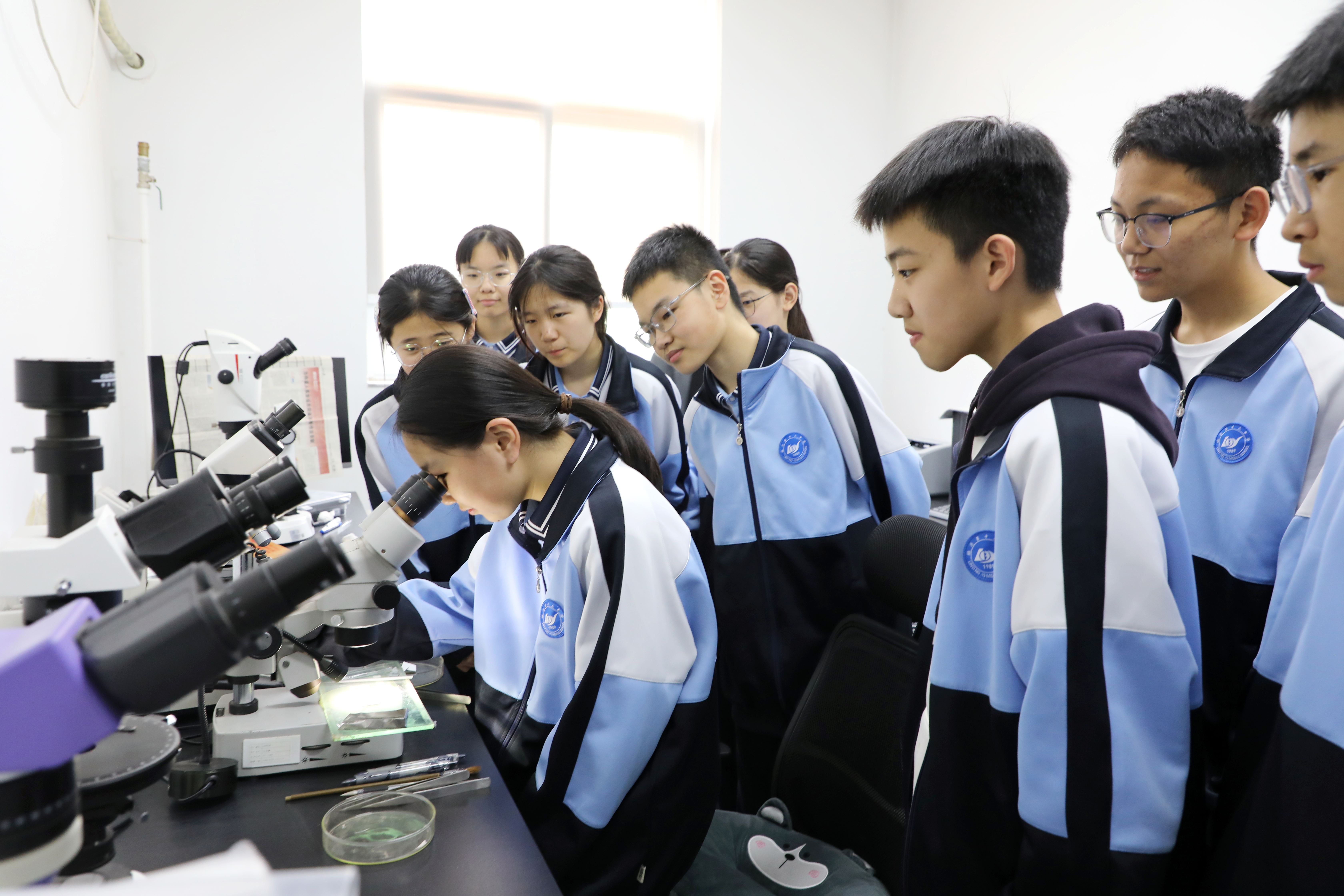 在青年工程师于洋、刘昊松带领下,同学们参观了实验测试样品前处理、样品检测及金刚石鉴定等区域,了解土壤、岩石等样品的分析流程。于洋重点介绍了七队承担的平邑金银花产地土壤地球化学调查评价项目,结合本地实际,详细讲解了土壤污染的来源、危害、检测方法及防治措施等,让同学们深刻认识到保护土地资源、守护粮食安全的重要意义。于洋寄语同学们要从身边小事做起,爱护环境,减少使用塑料袋、不乱扔电池,争做真正的“地球小卫士”。同学们还亲手操作显微镜,观察金刚石、镁铝榴石和铬透辉石等宝石矿物的微观世界,感受地球宝藏的神奇。