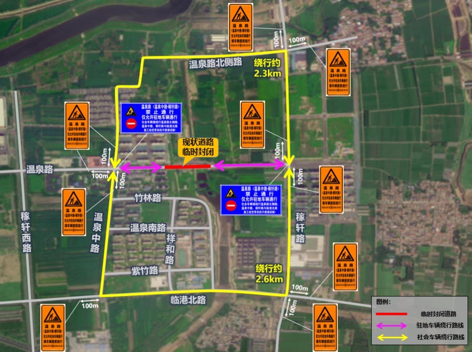 顺接施工期间,温泉路(温泉中路至稼轩路段)将实行临时封闭,禁止通行,仅允许沿线驻地车辆进出。为保障通行秩序,在温泉路与温泉中路交叉口、温泉路与稼轩路交叉口将同步安排交通安全员,引导其他社会过境车辆通过温泉中路、临港北路、稼轩路等周边现状道路绕行,以缓解交通拥堵,提高通行效率。
