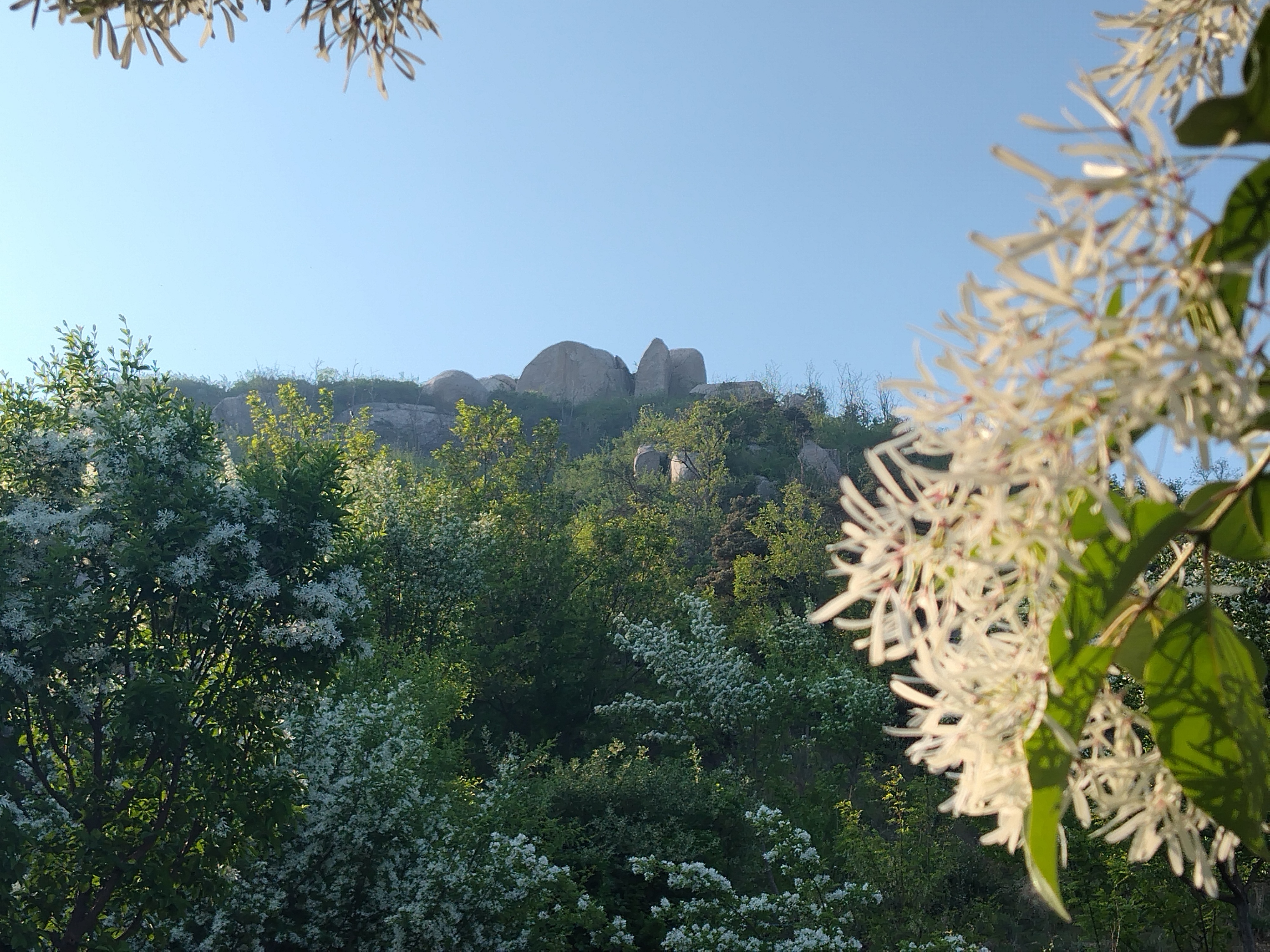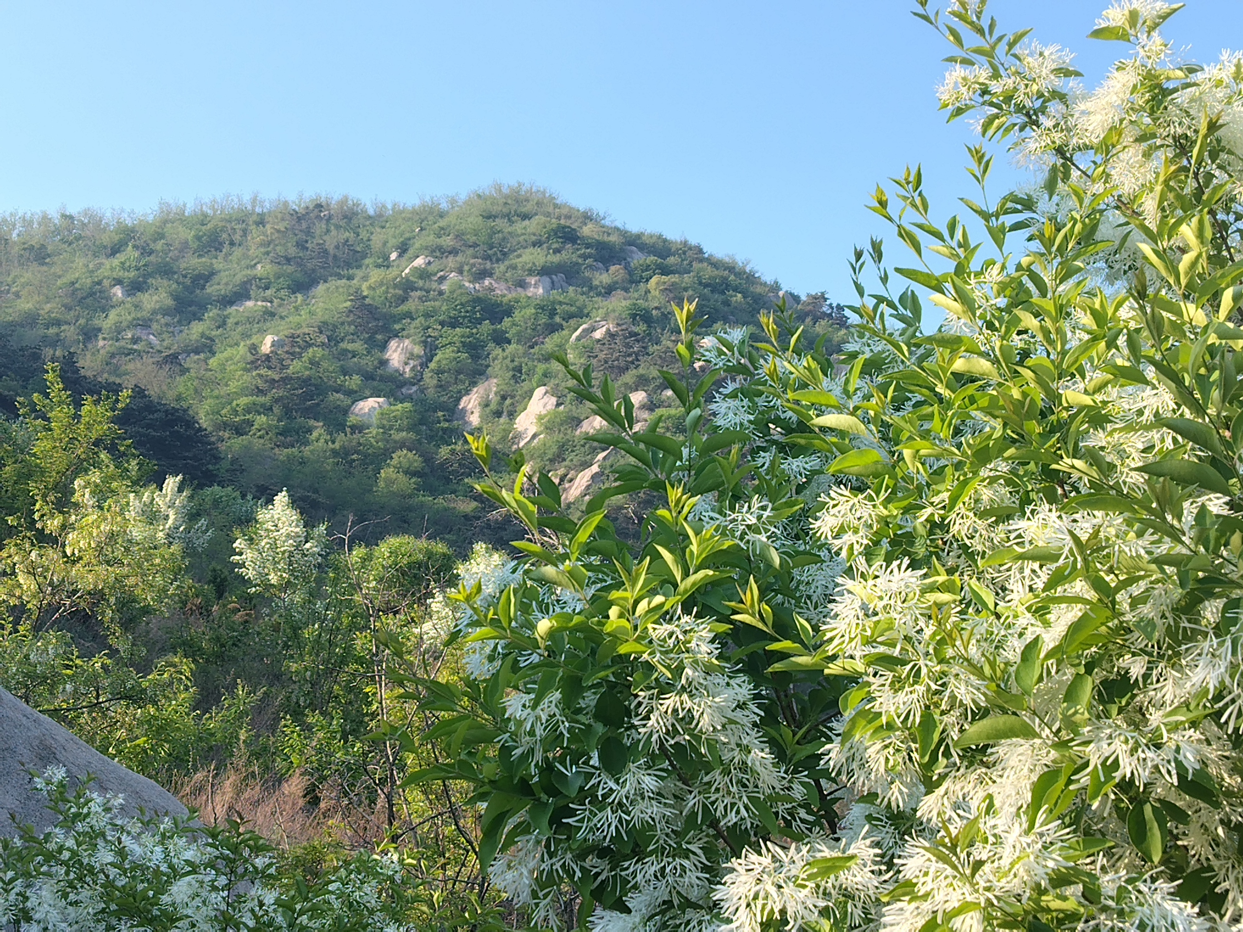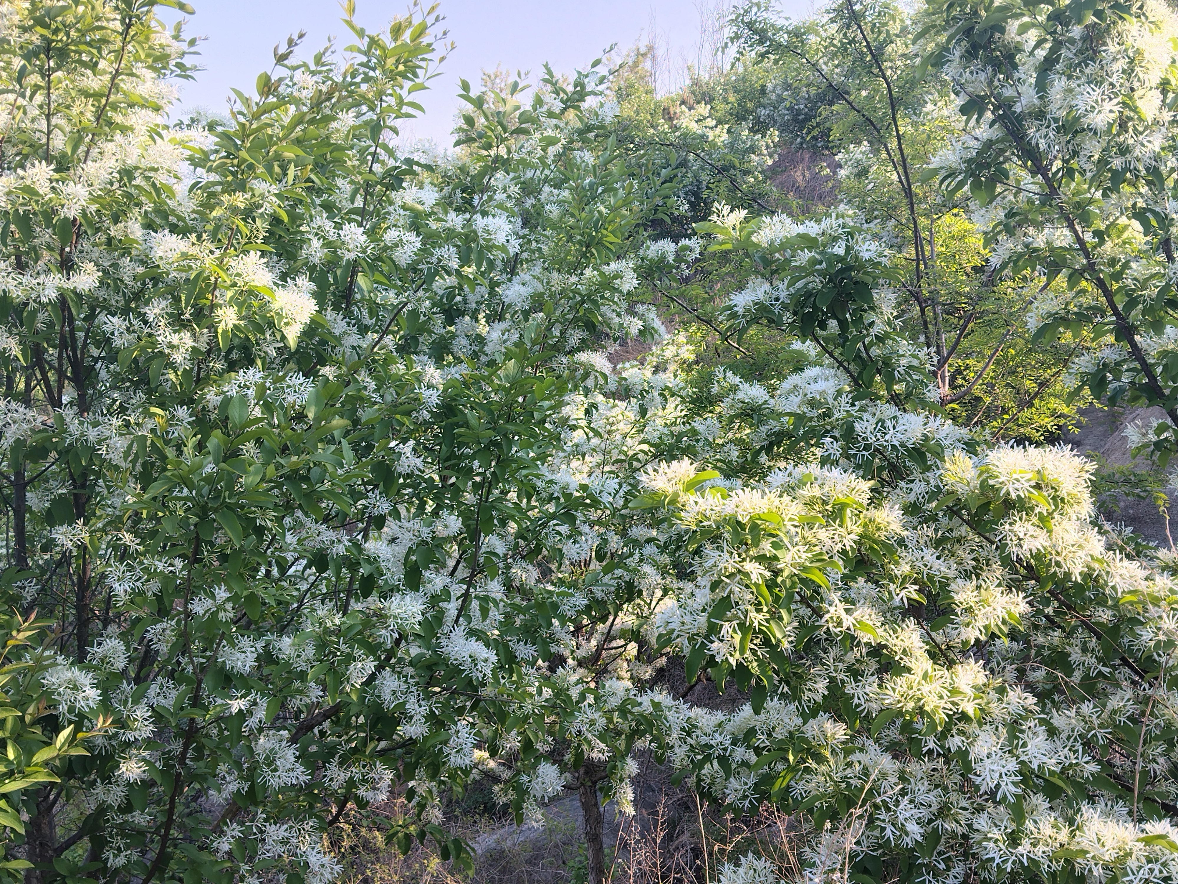 南天门山地处花岗岩地带,怪石嶙峋,姿态万千,与环绕山间的蜿蜒公路共同构成了一幅雄奇与秀美并存的山水画卷。其中最引人注目的,莫过于那漫山遍野的流苏花。流苏,因其花朵细密如丝、洁白如雪,形似古代仕女服饰上的流苏而得名。成片盛开的流苏花缀满枝头,远望如覆霜盖雪,近观则清香袭人,在嶙峋山石的映衬下,更显清雅脱俗,成为春日山野间一道独特的风景线。