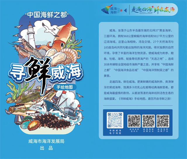 翻开新版“寻鲜威海”手绘地图,主色调“海洋蓝”依旧清新亮眼,在内容呈现上,地图进一步扩容升级,全面覆盖威海全域鲜味资源——