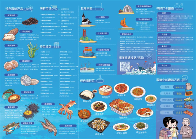 背面则分为“特色海鲜产品”“海鲜市场”“特色酒店”“赶海乐园”“经典海鲜菜”“海洋非遗技艺/活动”“寻鲜打卡路线”“海鲜中的趣味方言”8个版块,介绍了威海刺参、乳山牡蛎、荣成海带等特色海产品,附上海鲜市场、特色酒店、赶海乐园地址信息,并贴心推出了4条打卡路线。