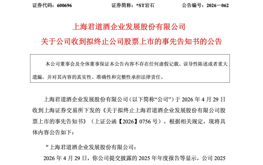 4月29日晚间,*ST岩石发布公告称,公司收到上交所下发的《关于拟终止上海君道酒企业发展股份有限公司股票上市的事先告知书》。