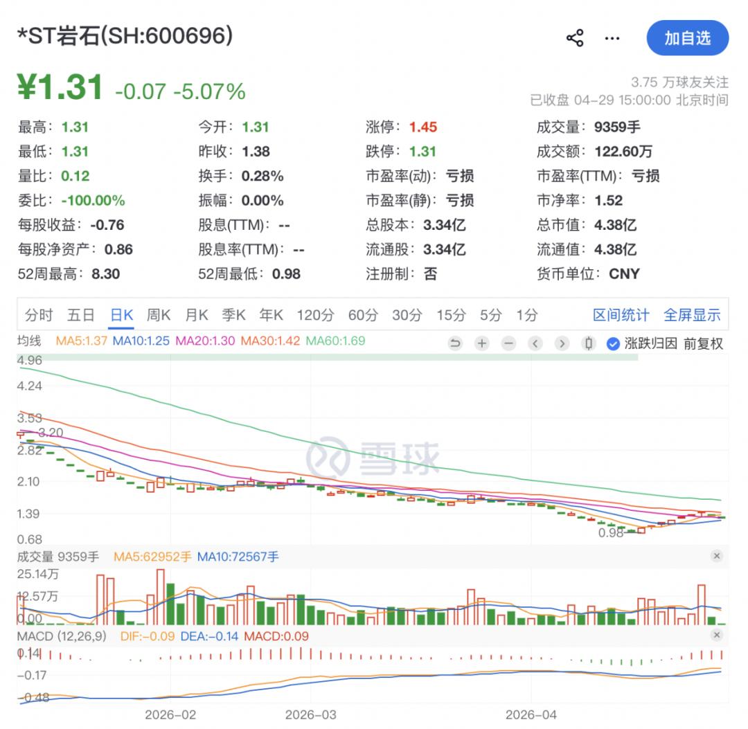 截至4月29日收盘,*ST岩石股价报1.31元/股,总市值为4.38亿元。