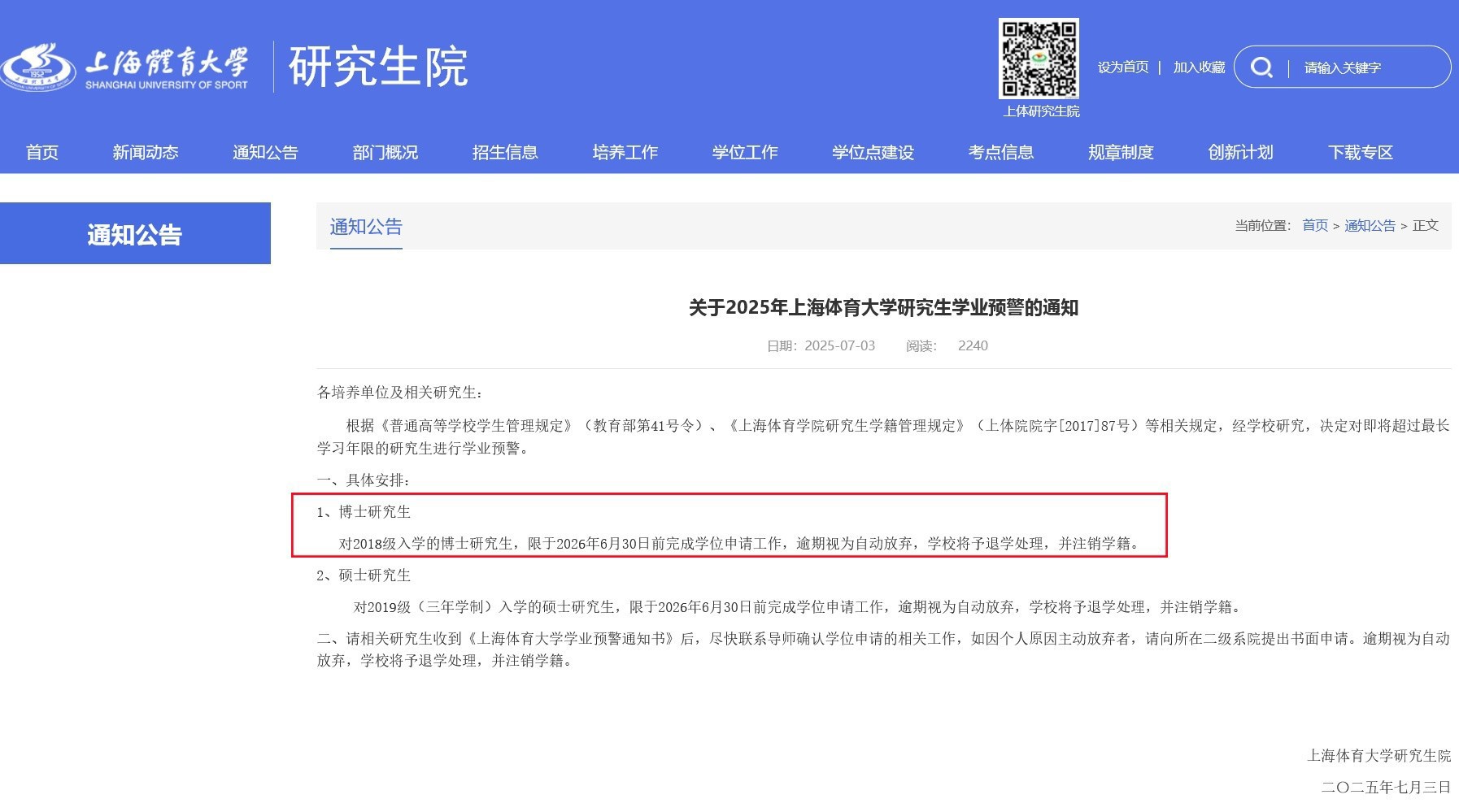 记者注意到,2025年7月,上海体育大学研究生院发布《关于2025年上海体育大学研究生学业预警的通知》称,经学校研究,决定对即将超过最长学习年限的研究生进行学业预警。对于2018级入学的博士研究生,限于2026年6月30日前完成学位申请工作,逾期视为自动放弃,学校将予退学处理,并注销学籍。随通知发布的“研究生学业预警名单”中,孙杨所就读的“运动人体科学”专业共有7名博士研究生出现在该名单中,名单只显示学号,没有姓名。