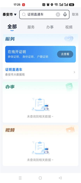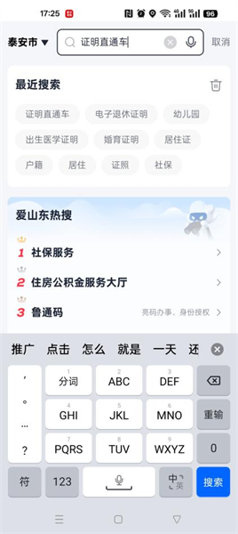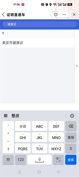进入证照申领界面,搜索框输入泰安市健康证,点击搜索