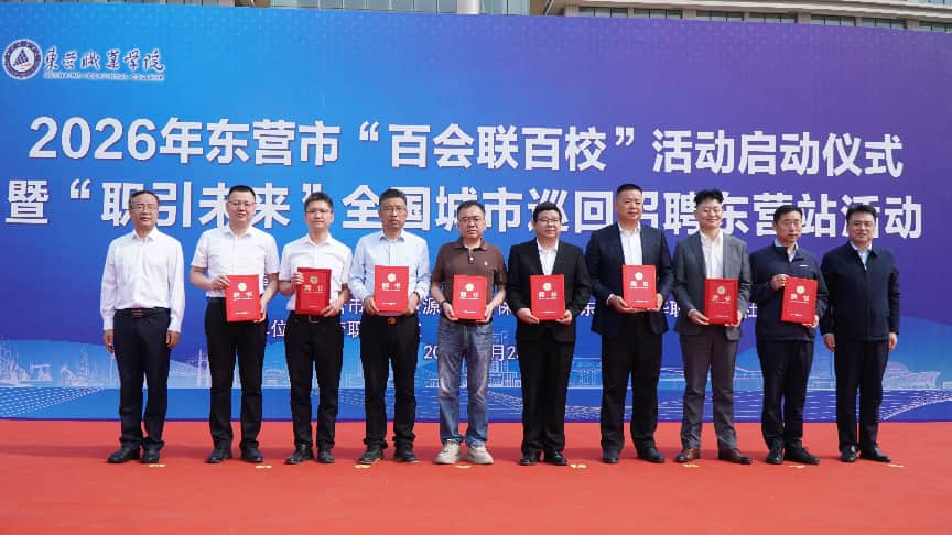 4月26日,2026年东营市“百会联百校”活动启动仪式暨“职引未来”全国城市巡回招聘东营站活动在东营职业学院隆重举行。此次活动由市工商联、市教育局、市人力资源和社会保障局、市中华职教社联合主办,东营职业学院承办。