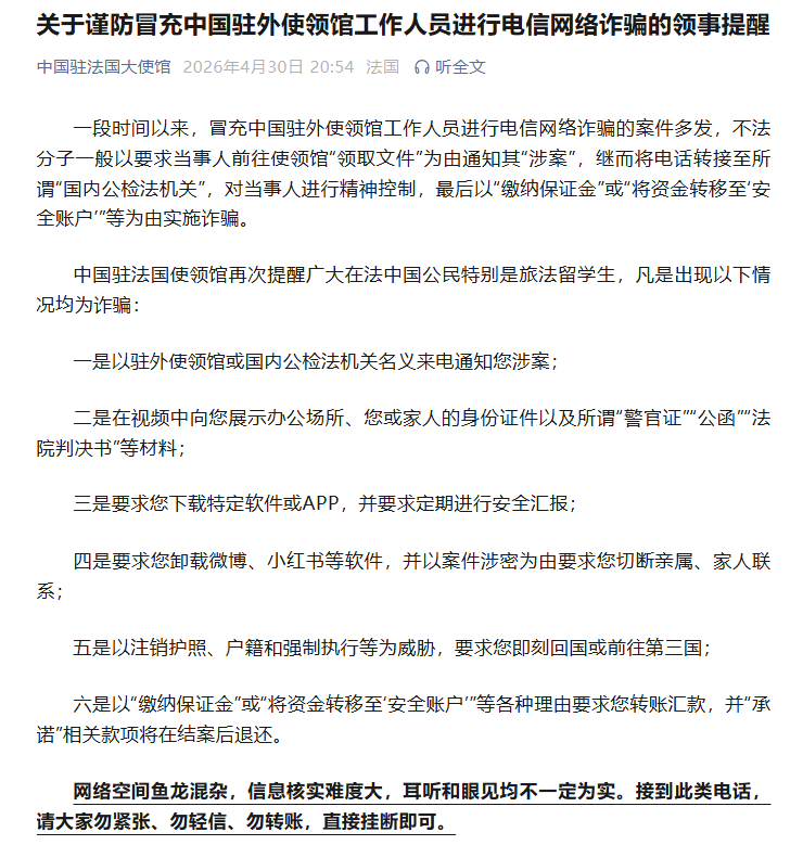近期冒充中国驻外使领馆工作人员电诈案件多发,驻法使馆提醒