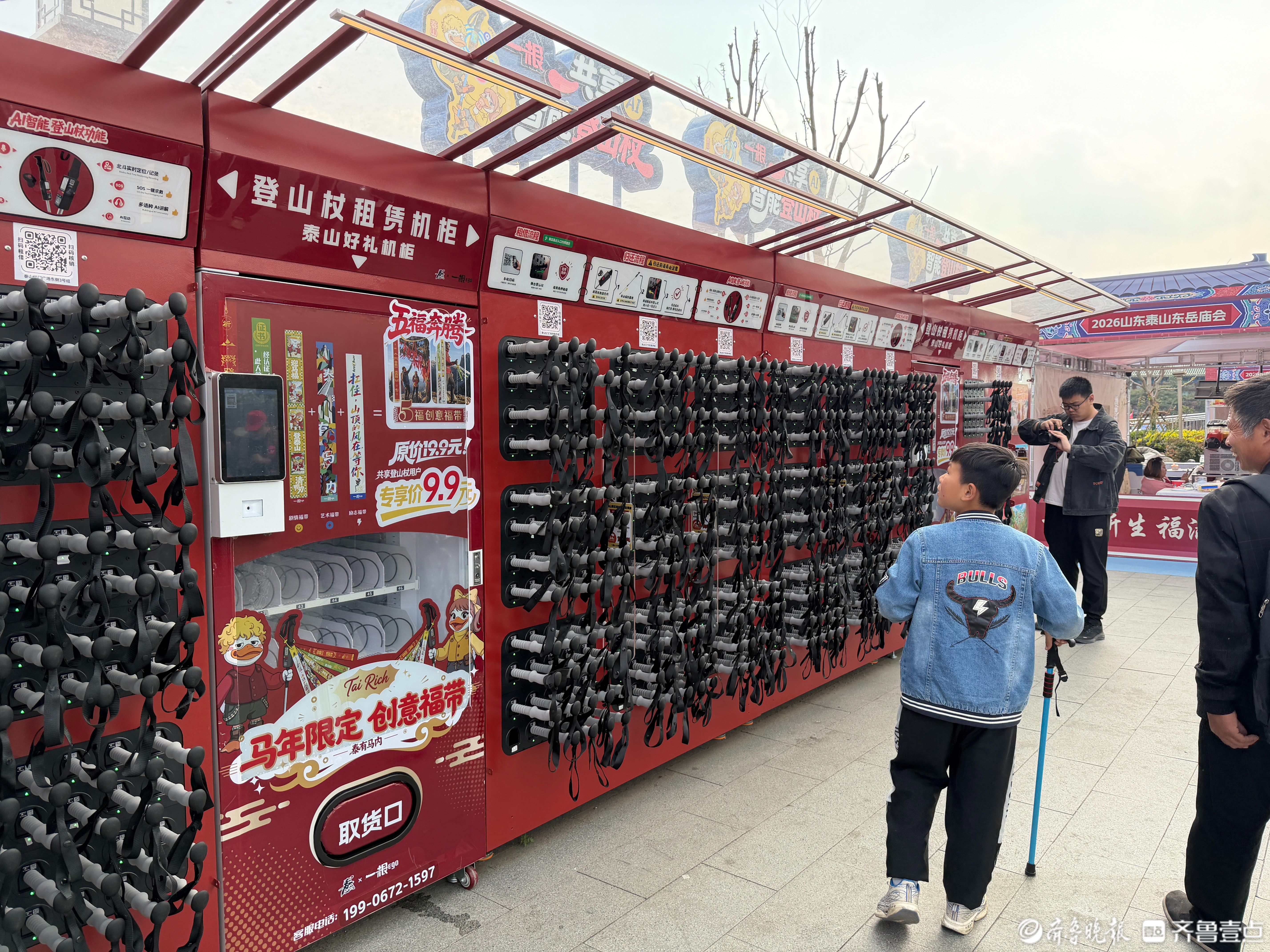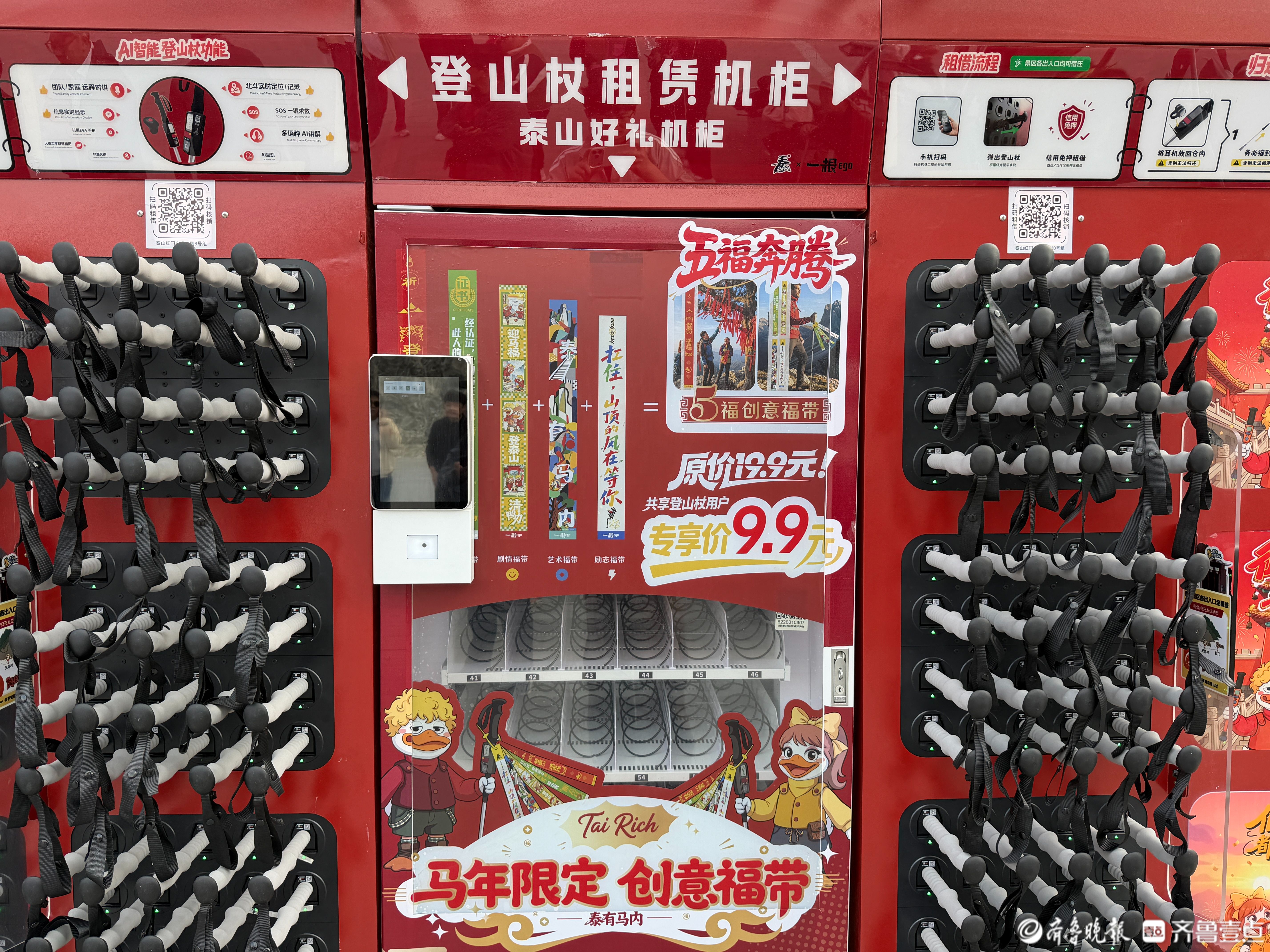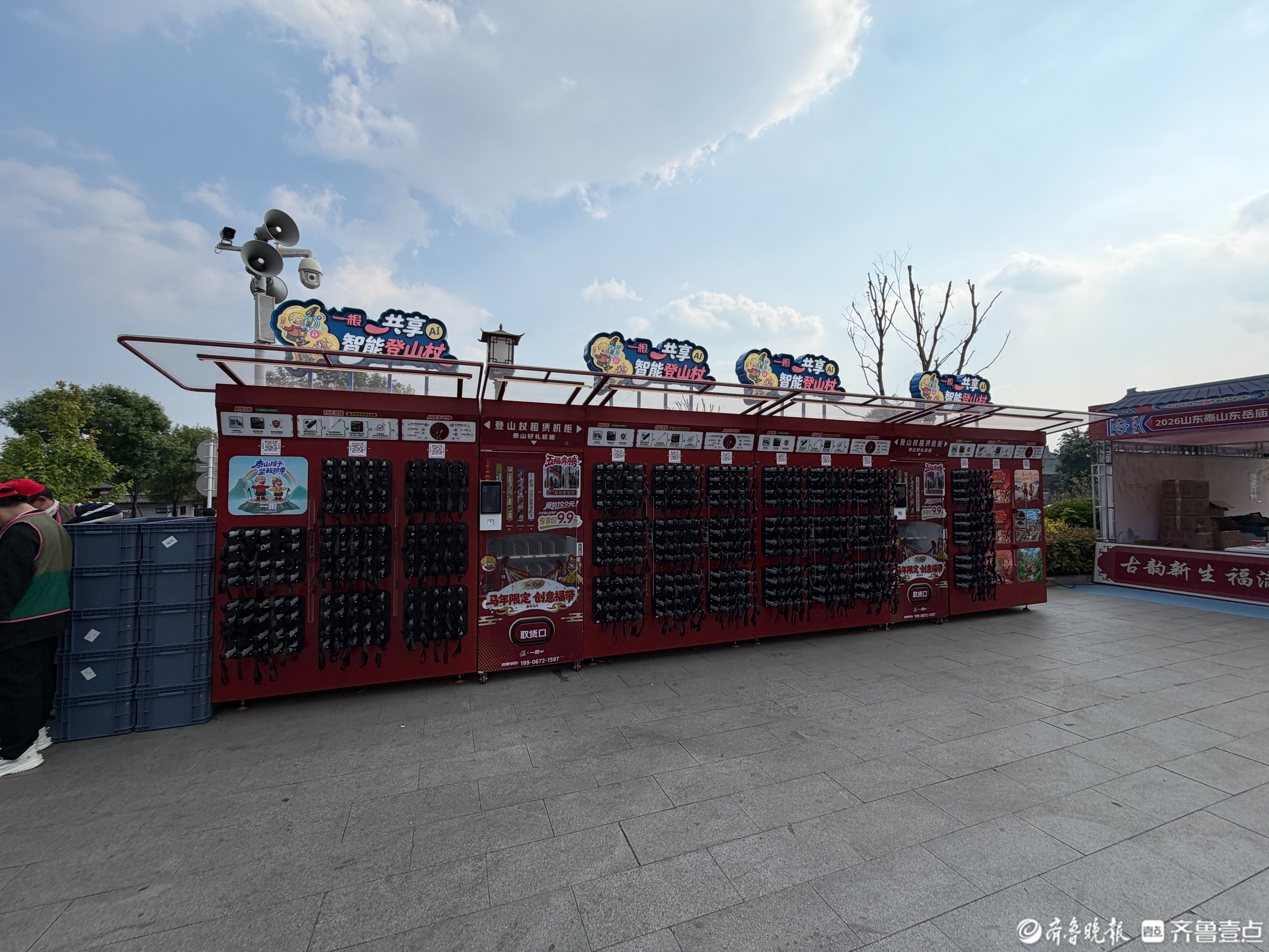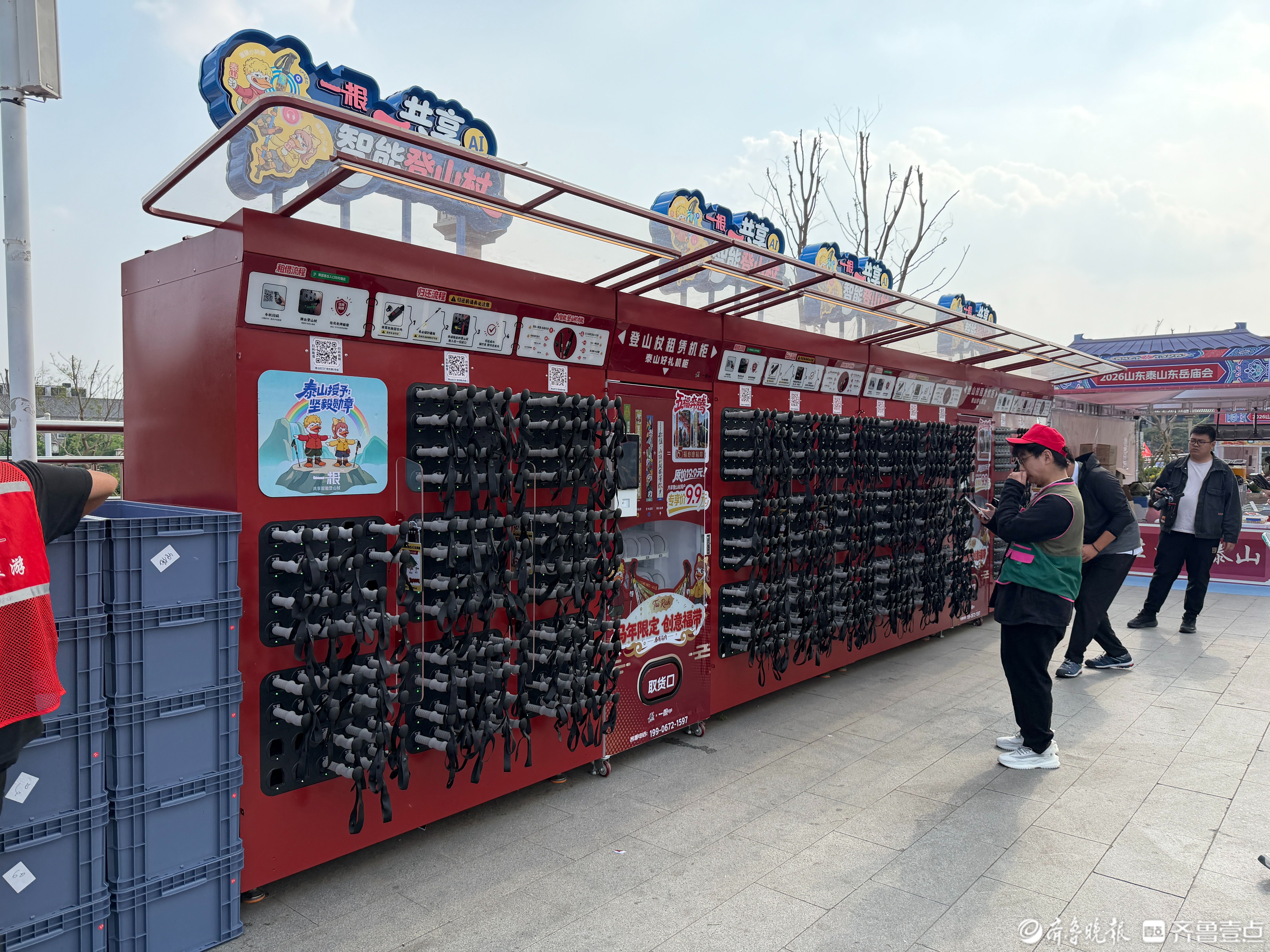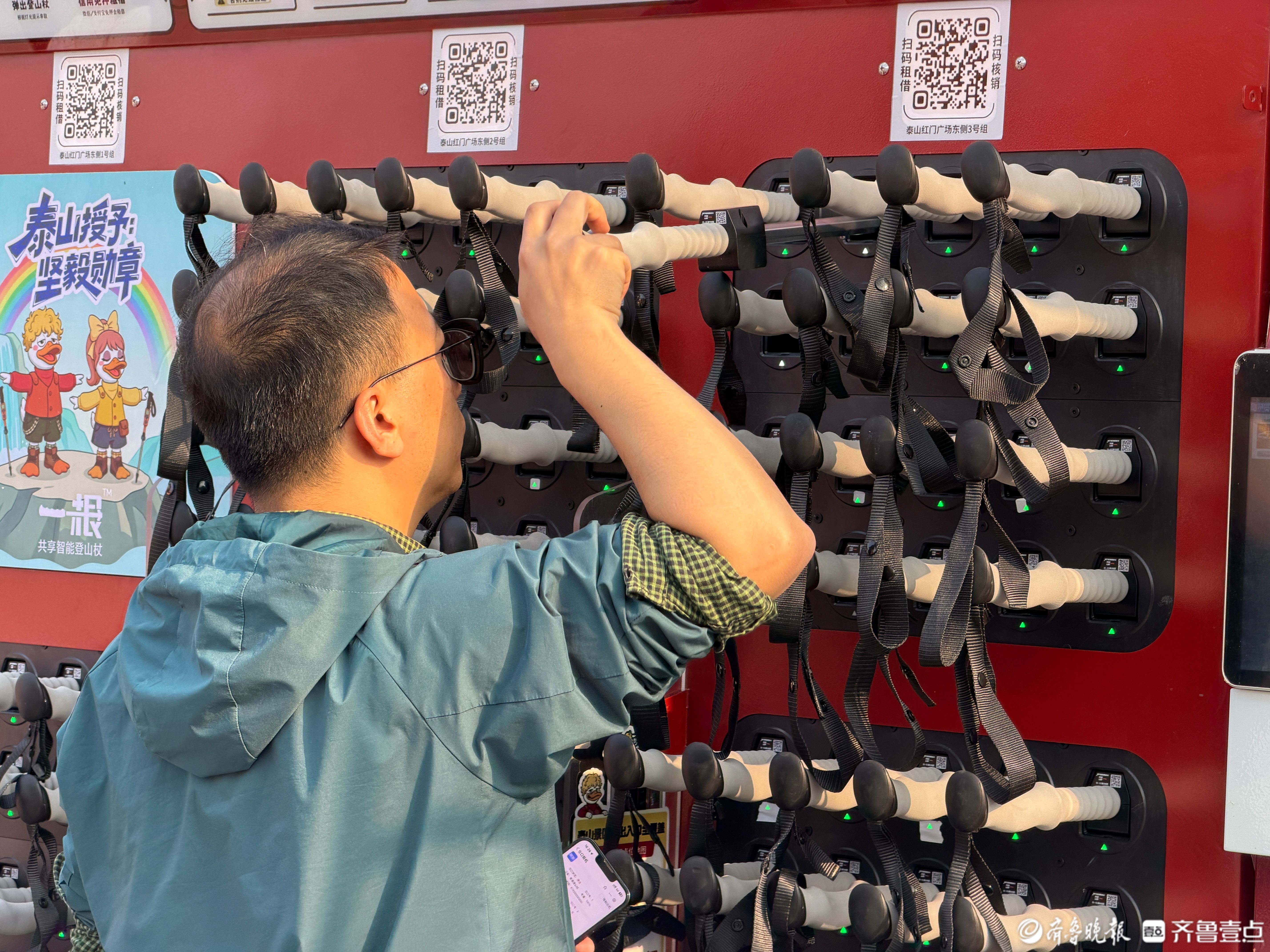 租借方面也很方便,红门、天外村、桃花峪三个主要登山口,都设了租借和归还点。大家不用线下排队,用微信、支付宝扫官方二维码,就能一键租借、就近归还,省时又省力。景区工作人员说,之后还会增加租借点位,让更多来爬泰山的人,都能轻松用到安全、好用又环保的共享登山杖。