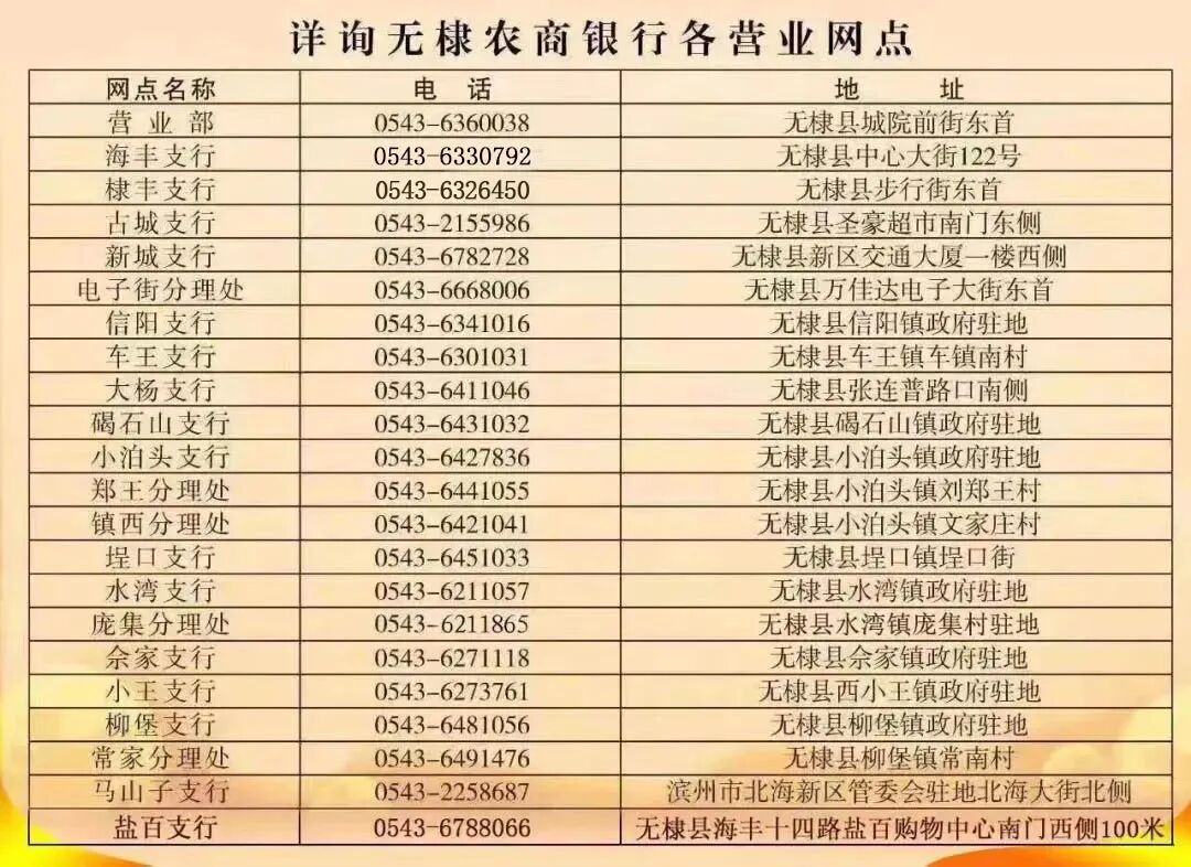 期间如有疑问,请拨打营业网点服务电话咨询。给您造成的不便,敬请谅解!感谢您对无棣农商银行的理解与支持。敬请广大客户相互告知。