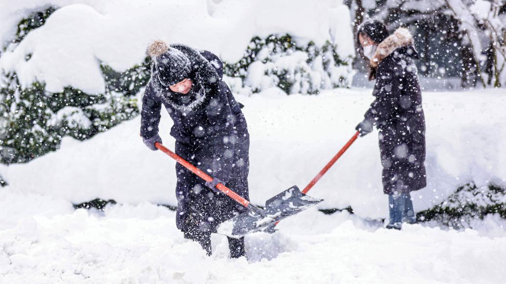 12月21日,在山东省荣成市成山大道中段,市民在清扫路面积雪。新华社 图