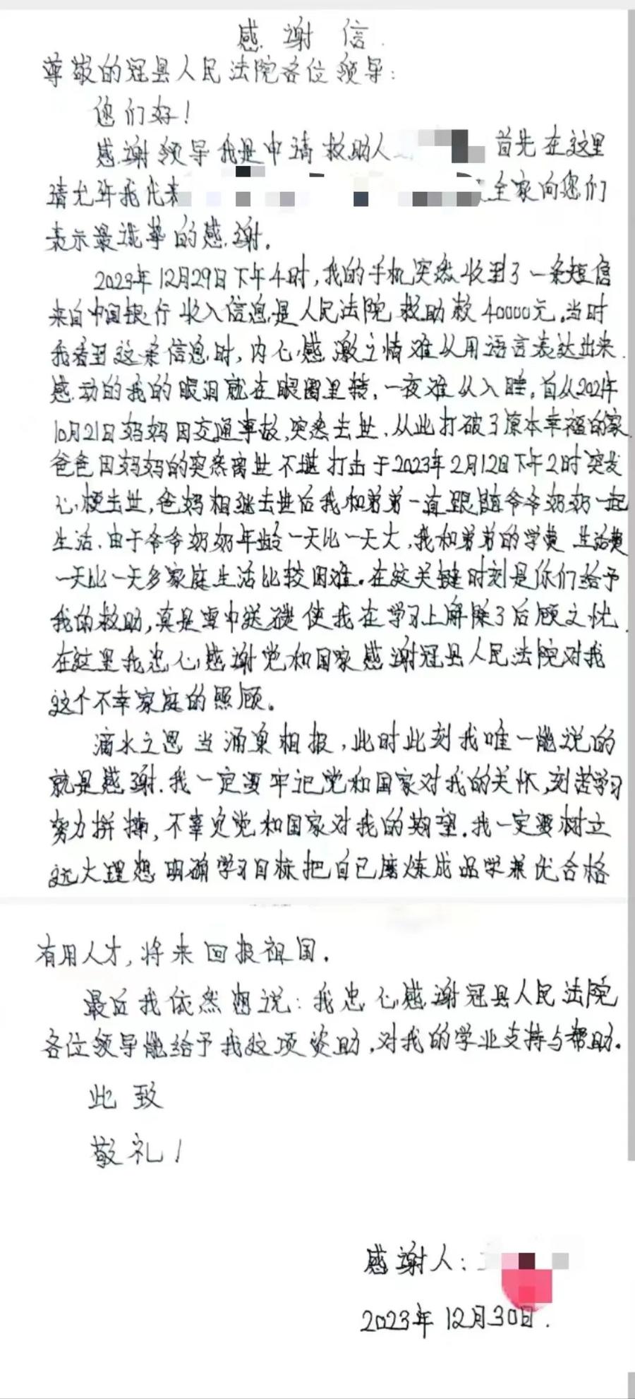 一封来自司法救助申请人的感谢信