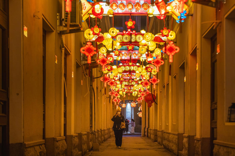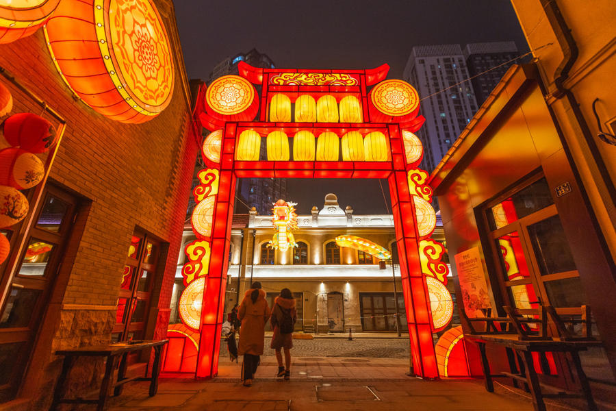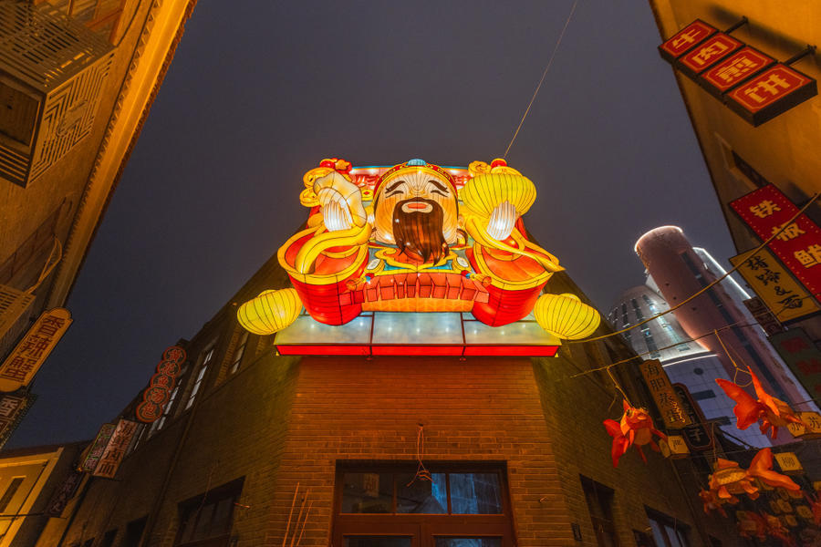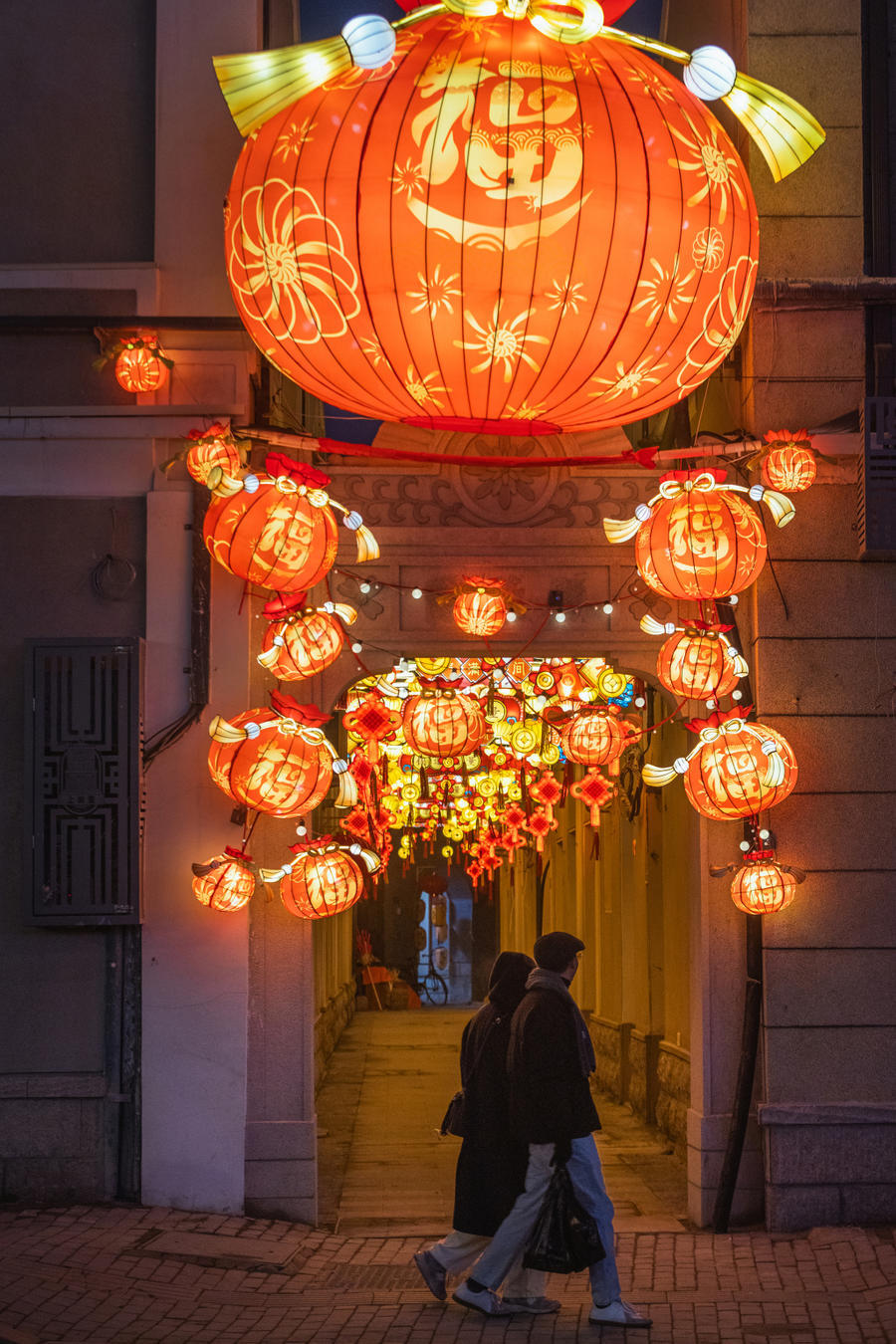 在大鲍岛文化休闲街区,高密路、海泊路上已经是一片张灯结彩、喜喜庆庆的热闹场景。一串串灯笼营造出绚丽多彩的“天幕”,让漫步其中的人们感受到了老里院冬日的“脉搏”与“温度”。