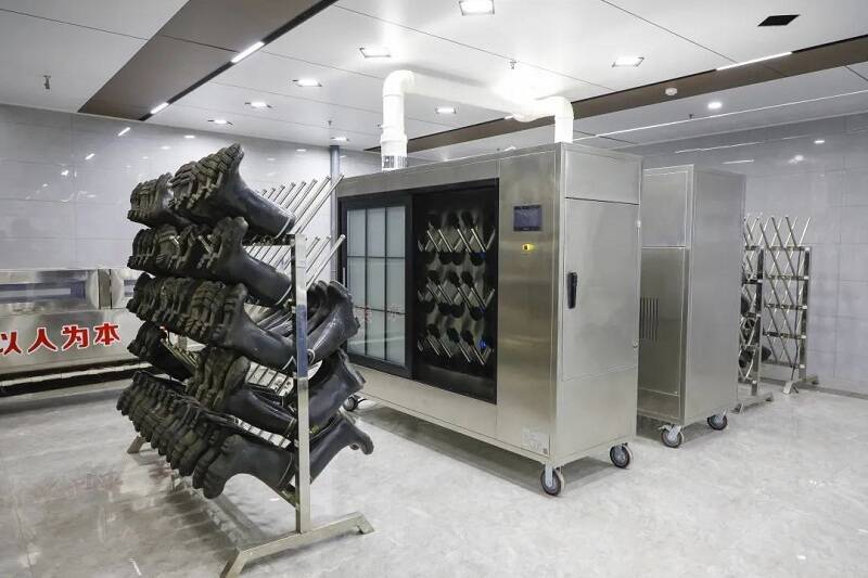 为解决洗衣烘干机上热慢、矿靴潮湿难清洗等问题,该矿购置4台洗衣机和烘干设备,安装两台刷靴机,职工上井后将靴子和工作服放到指定地点后,由后勤服务中心人员统一进行洗刷、烘干,分类存放,下井前到指定地点领取干净的工作服和靴子即可,形成“一条龙”服务管理,达到“保姆式”更衣体验,让职工“轻装上阵”、安心工作。
