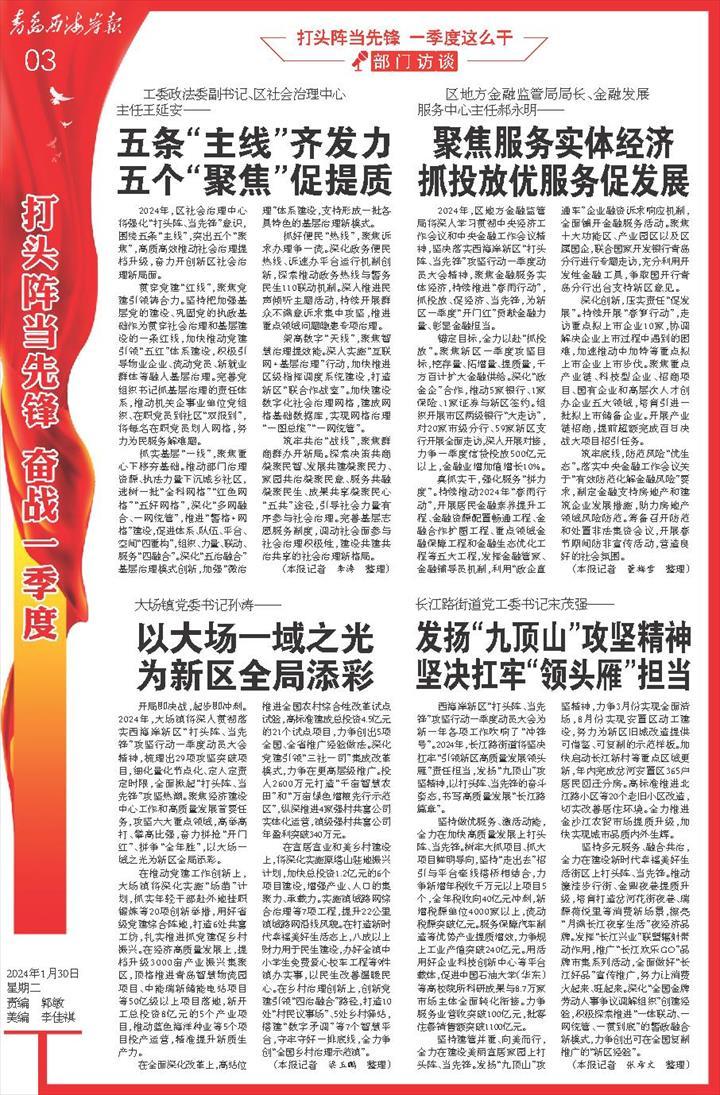 开局即决战,起步即冲刺。2024年,大场镇将深入贯彻落实西海岸新区“打头阵、当先锋”攻坚行动一季度动员大会精神,梳理出29项攻坚突破项目,细化量化节点化、定人定责定时限,全面掀起“打头阵、当先锋”攻坚热潮。聚焦经济建设中心工作和高质量发展首要任务,攻坚六大重点领域,高举高打、攀高比强,奋力拼抢“开门红”、拼争“全年胜”,以大场一域之光为新区全局添彩。