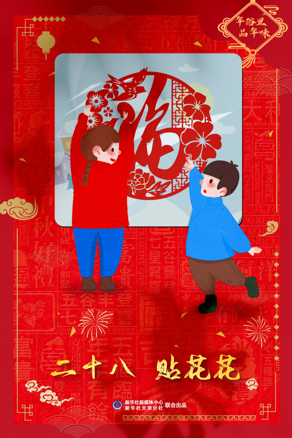 民谚说:“二十八,贴花花”,意思是说腊月二十八这天要贴春联和窗花。这是过大年的重要标志,寄托了人们辞旧迎新、祈福纳祥的美好愿望。