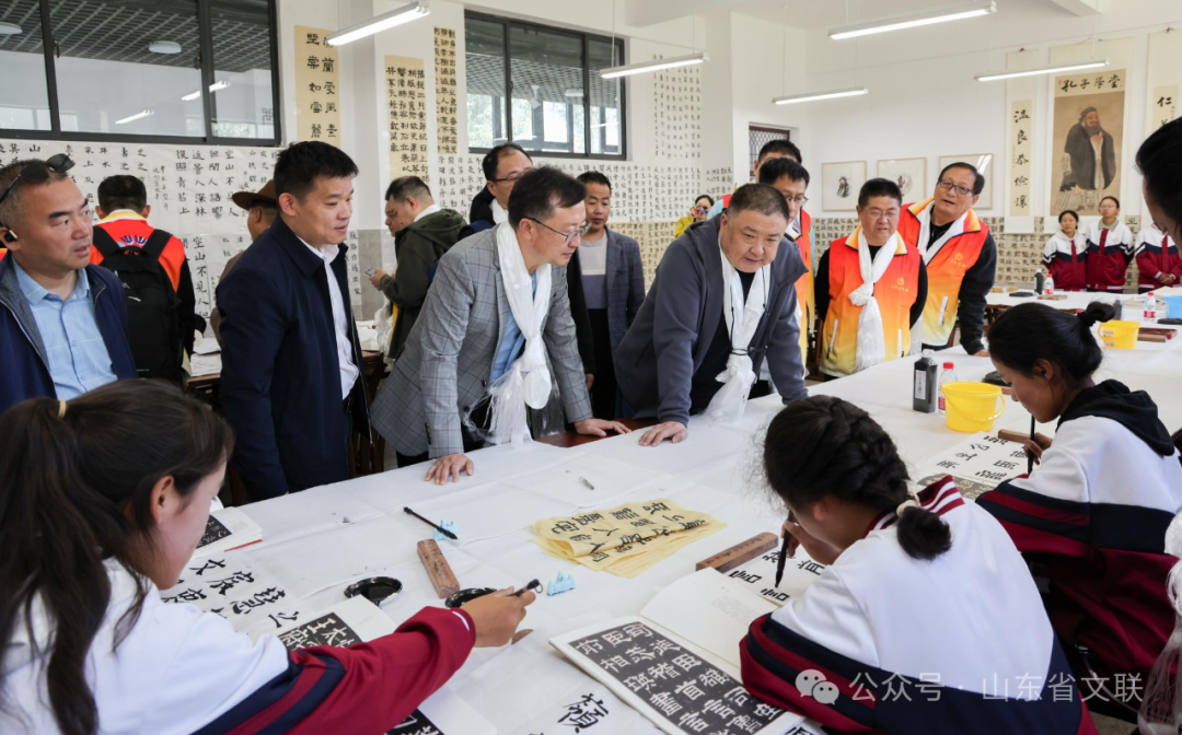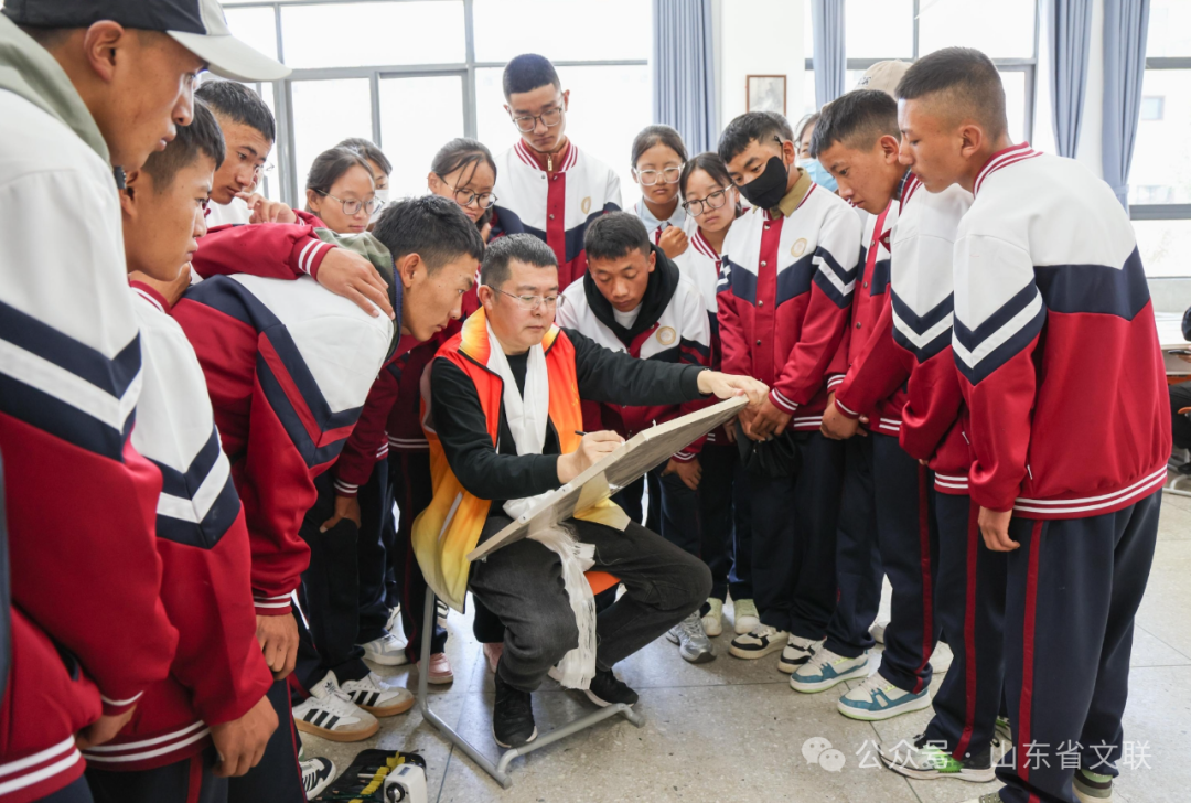 在日喀则齐鲁高中,开展了山东省文联“蒲公英计划”文艺进校园援藏培训活动。山东省文联艺术家王瑞、李岩、杨文森、吴磊、倪和军、杨雯、杨国栋等为齐鲁高中的学生们进行了现场授课。艺术家们以笔墨书法、写意花鸟和素描写生为重点,结合个人研习书画的心得体会为学生逐一进行讲解和示范,提升了学生们的艺术学业水平。艺术家们还与学生现场合作国画作品赠送给学校,坚定了学生们对艺术之路的信心和决心。学生们精心书写了藏文书法作品赠送给艺术家并邀请他们共同跳起锅庄舞表达祝福和感谢。