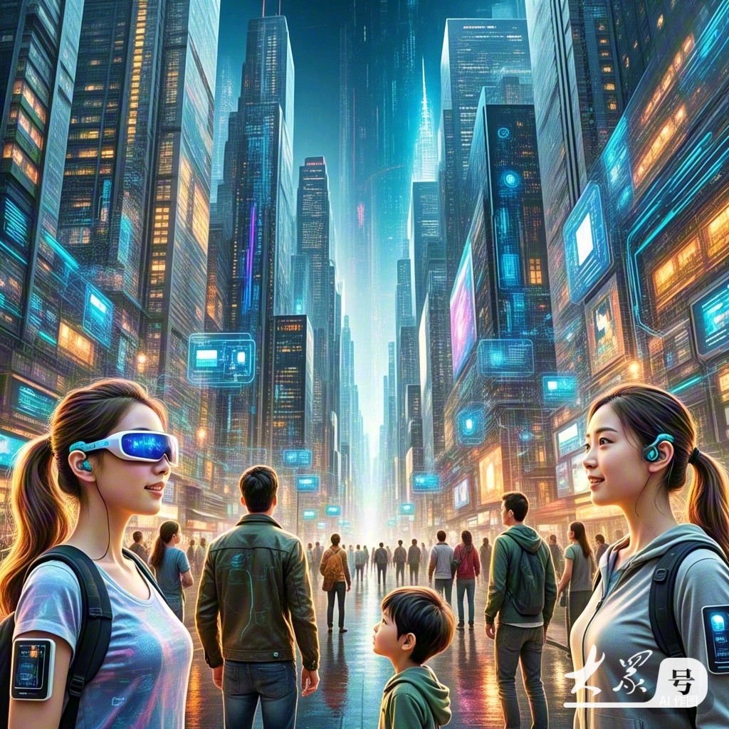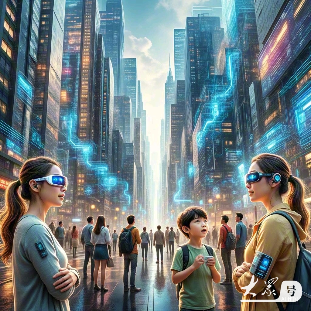 AI元素:图片中的AI元素以科技感和智能感为主,比如智能穿戴设备、虚拟电子屏等,这些元素体现了AI在都市生活中的广泛应用。
