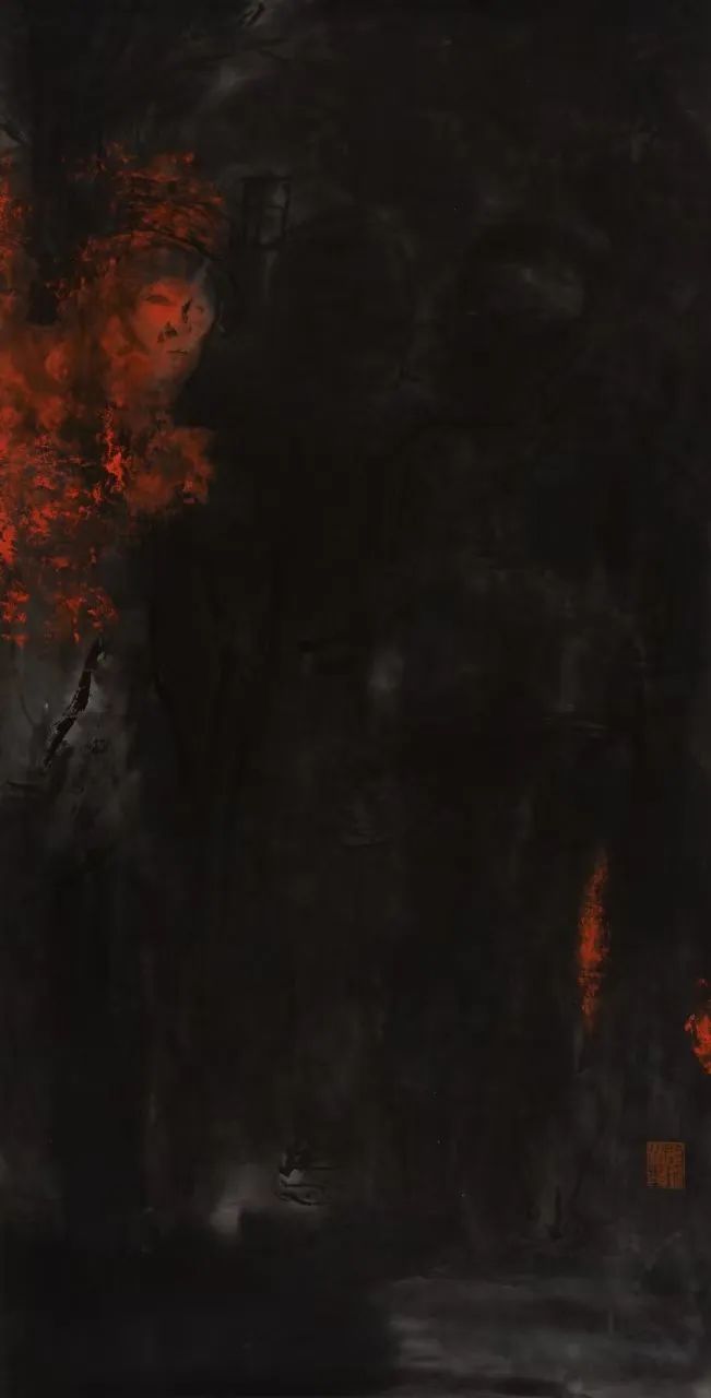面对启琼的水墨人物,从画面整体而深沉的水墨气势中,则能读出一些山水的景象和意趣。这与启琼常常游心目识于张家界的群峰叠嶂,似乎有着一种与山水相通的独特气质,形成了一种自由自在的挥洒。张家界的山山水水是养眼亦是养画的,启琼人物画的问墨之路,有其内在个性特征的支撑,有其自我形式语言的完善。从展览中水墨作品整体风貌而言,应该是从“用墨”上升为“问墨”的一种意识转化。问墨有情,在于问墨有心,又归结于笔墨中心手相应的磨练。问墨有道,源于问墨中的理法规范,又努力画出别具一格的水墨情怀。(节选)