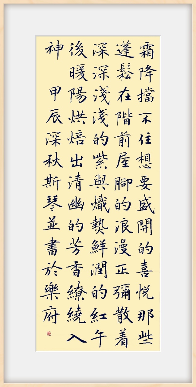 作为女性书家,我们既要照顾家人,又想专心求艺,时间精力本就有限,而随着年岁的增长,精力、体力都在下降。所以我们应当发挥女性书家的自身优势,走精、巧、小、雅的路线,以笔墨记录生活的点滴美好,聚沙成堆,积水成池,将人生劣势变为优势,将别人忽略的生存体验,用笔墨呈现出来,可读可赏,共情共识,以笔墨传递女性的坚韧、温暖、乐观。