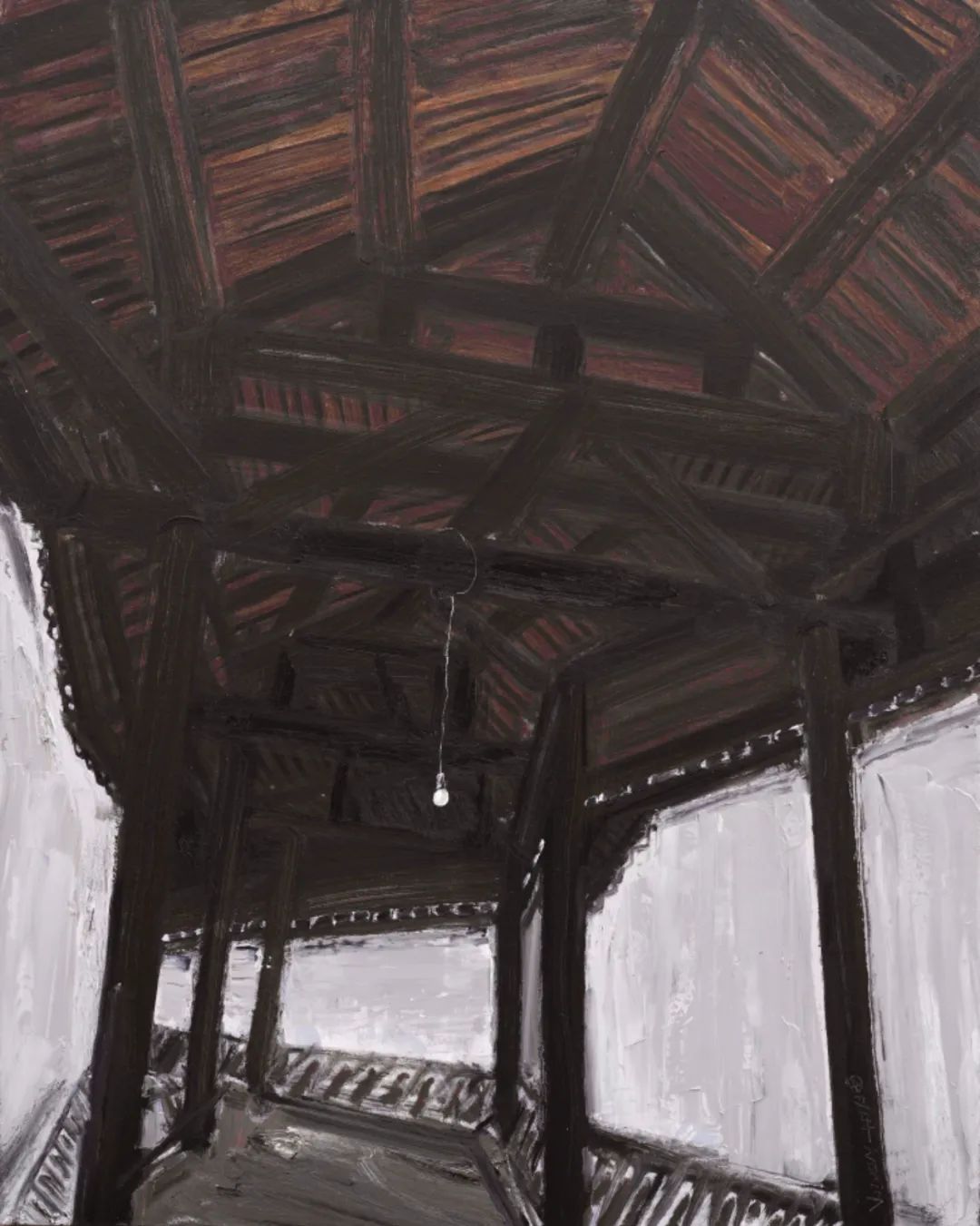 第三、画面的书写感、写意性。很多绘画是比较被动地去观察对象,然后去再现对象,但是田老师是因为有自己的想法,有一种设计感,他能够在画面里面随心所欲地来书写,我觉得这种书写性也是特别打动人,特别感人的。他展览的题目是“无人之境”,我看了这么多画,虽然画面没有出现人的形象,但是我恰恰看到的是人。他的画里面无论是自然的风景也好,还是一些特别不起眼的角落,一些长廊,一些门洞,这里面都留下了人的痕迹,都有人的生命力在这种场域里面。如果是纯粹的自然,没有人工的痕迹在里面,这种景我觉得好像我们也不太愿意画,有些大自然的鬼斧神工,它已经是一个完美的创造了,比如九寨沟这种风景,油画家似乎不知道该怎么画了。但在一些不经意的、不被别人注意到的那些角落里面,田老师恰恰发现了美,在这里我们也能感受到人在这个时空下他所传递的一些气息,我觉得更重要的还是有田老师个人的情感,他个人的属性在里面。他画的《衬衫》,我能感觉得到衬衣上人的体温,甚至于能感受到有一点略略的汗味、烟草的味道在上面。笔触、肌理所形成的那种美感,我觉得是非常耐看的,画面非常有生命力与冲击力。