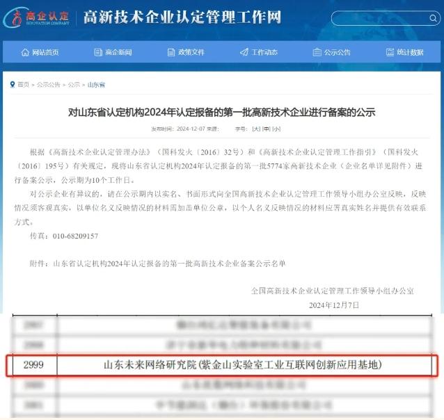 近日,全国高新技术企业认定管理工作领导小组办公室发布了“山东省认定机构2024年认定报备的第一批高新技术企业进行备案的公示名单”,山东未来网络研究院通过2024年高新技术企业认定。