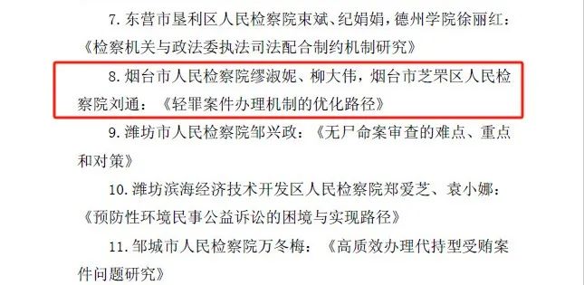 为大力推进人才强检建设,以高层次人才引领高水平检察队伍、高质量检察工作,山东省检察院围绕“‘高质效办好每一个案件’,推进检察工作现代化”主题组织“双联双评”征文比赛。经检察系统内外部专家学者多轮评审,最终确定优秀研究成果。烟台市检察院缪淑妮、柳大伟,芝罘区检察院刘通撰写的《轻罪案件办理机制的优化路径》荣获三等奖。