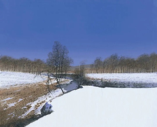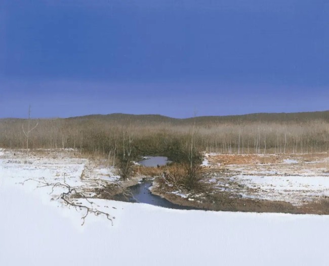 陆庆龙绘画中的每一笔似乎都在凝固时光,在意识时间中感受生命的沉静和密度。展览中的作品素材多来自他的家乡,他用现实时间创作,却让绘画孤悬于现实时间之外。他的作品可以从梦中回返,听乡野平静的河水,还有鸟清脆的叫声。无论是草木间的小路,还是与田野相邻的事物,经由陆庆龙点化,便构筑起了富有诗意的家园图景,显现出“天人合一”的自然观对国人美学思维的影响。静谧的河床、铺满的油菜花、萧瑟的树木、银装素裹的丘陵等,温润缱绻,景语含情。