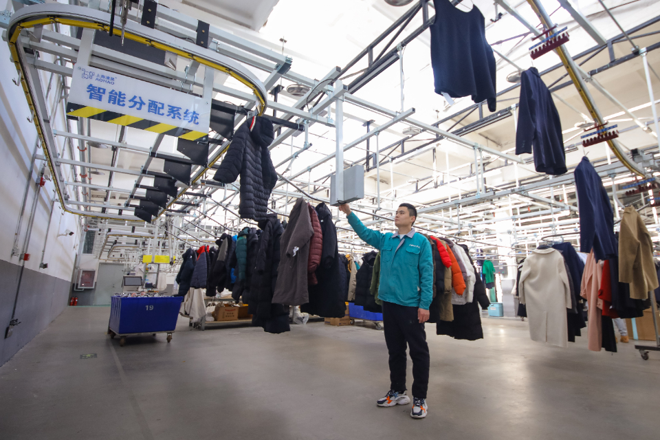 工作人员对干洗衣物进行智能分配。张鹰 摄