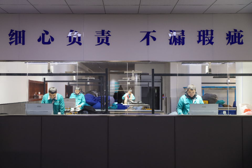 工作人员对干洗衣物进行入厂复检。张鹰 摄