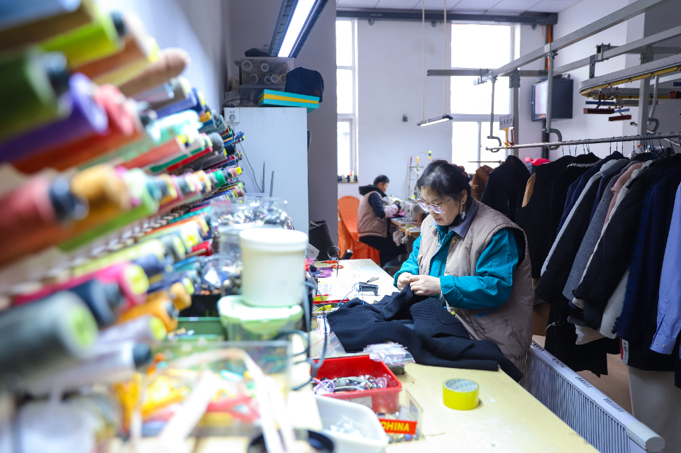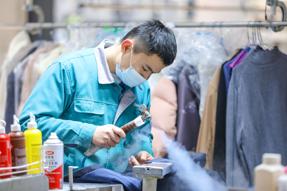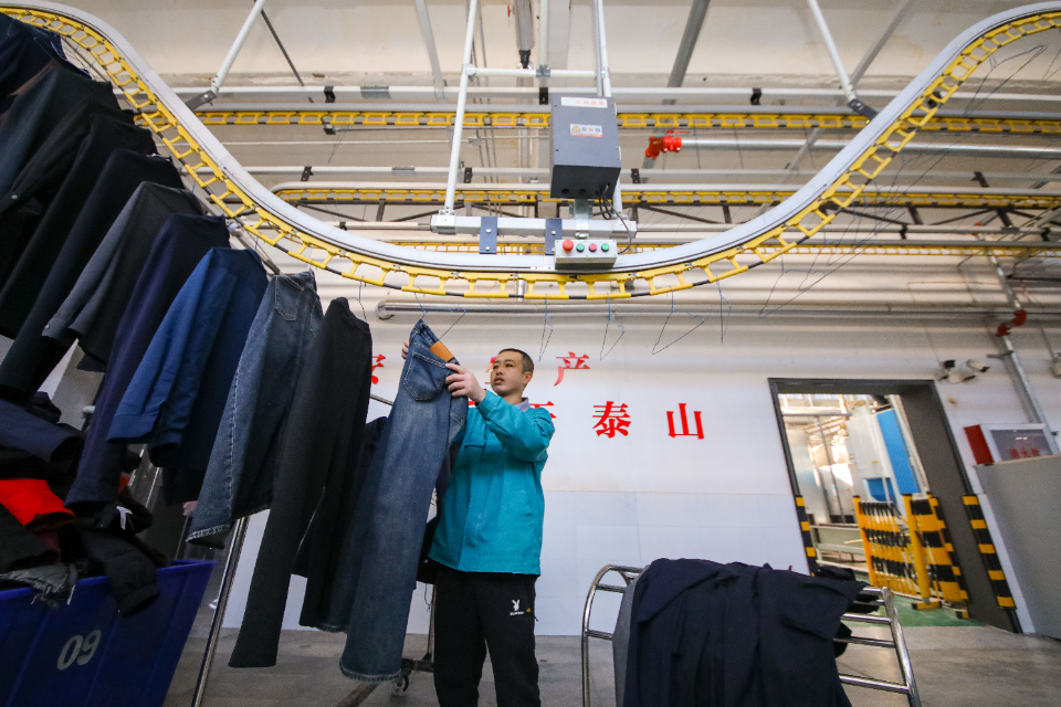 工作人员在车间对衣物进行清洗。张鹰 摄