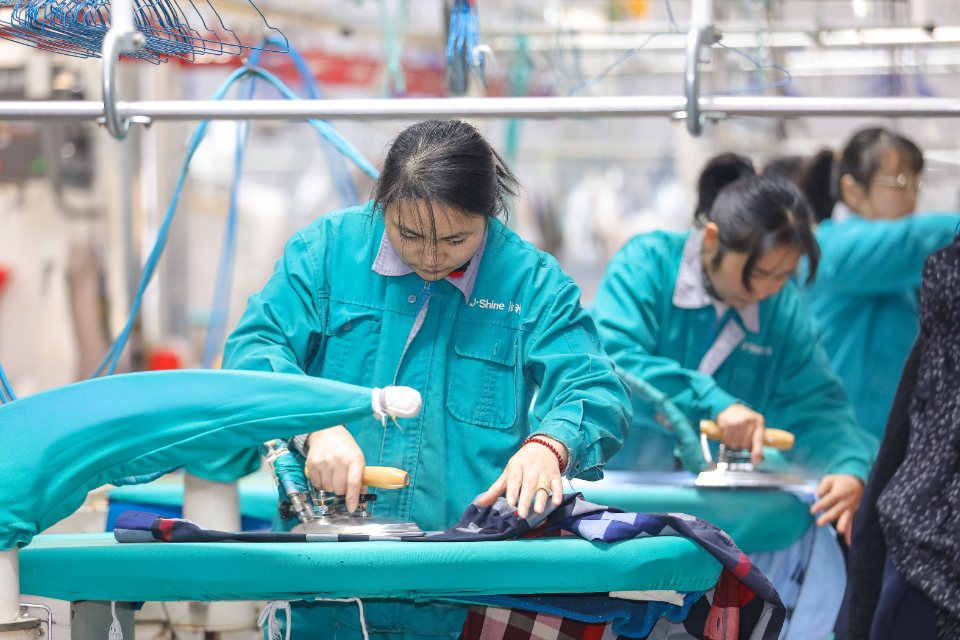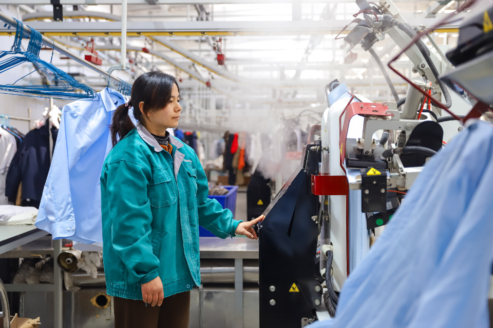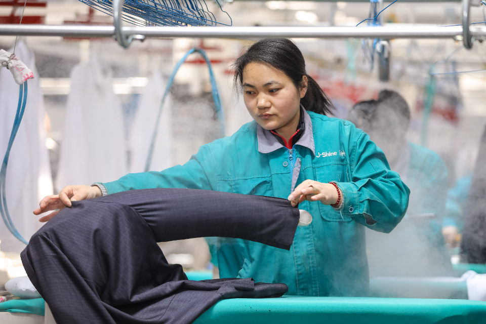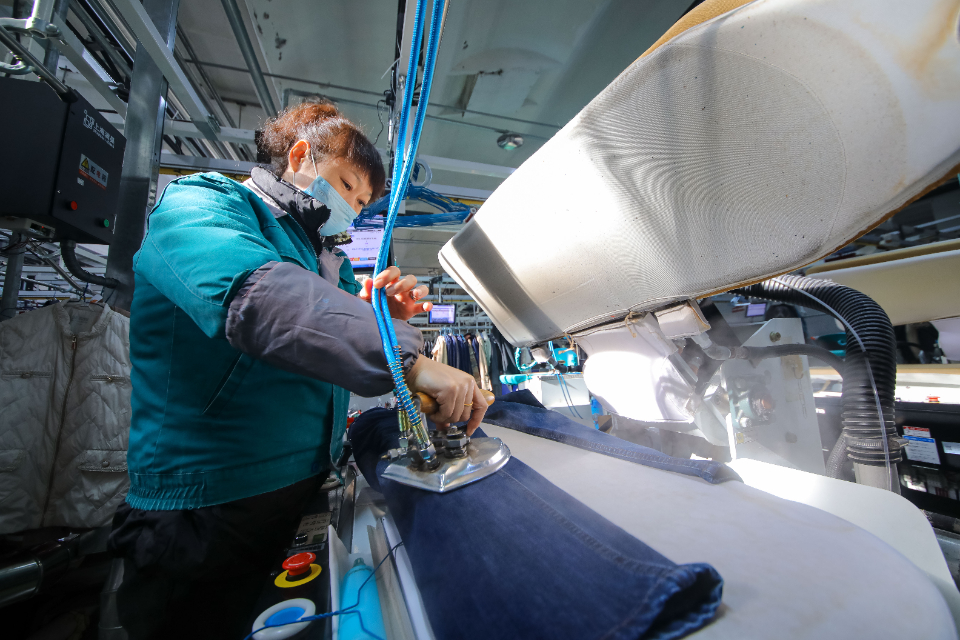 工作人员在车间对服装进行整烫定型。张鹰 摄