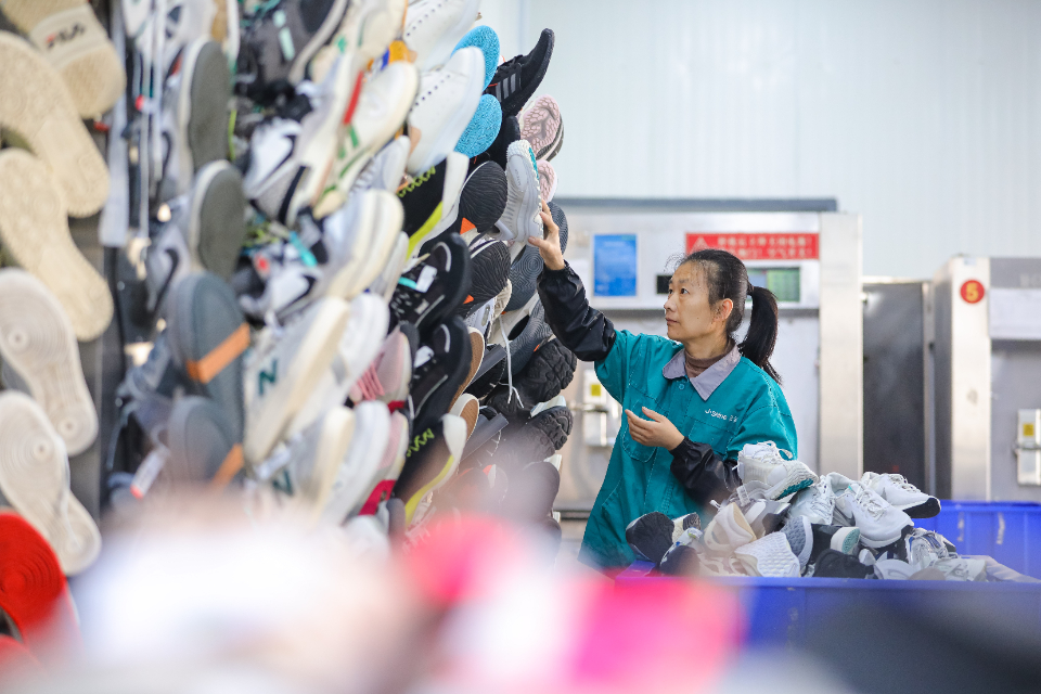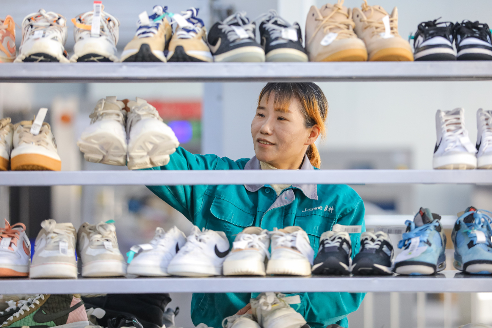 工作人员对洗好的鞋进行挂架吹干。张鹰 摄