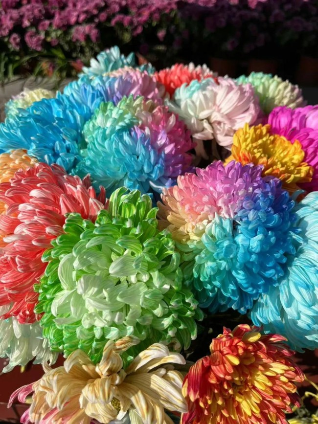 看到如此“变色龙”似的菊花,惊艳之余是对我的警示与启迪,是上苍的晓谕与教诲,在“形”与“质”不能变化的前提下,只能变“色”,让单一的色彩变得瑰丽绚烂、姹紫嫣红,也庶可值得一叹了!