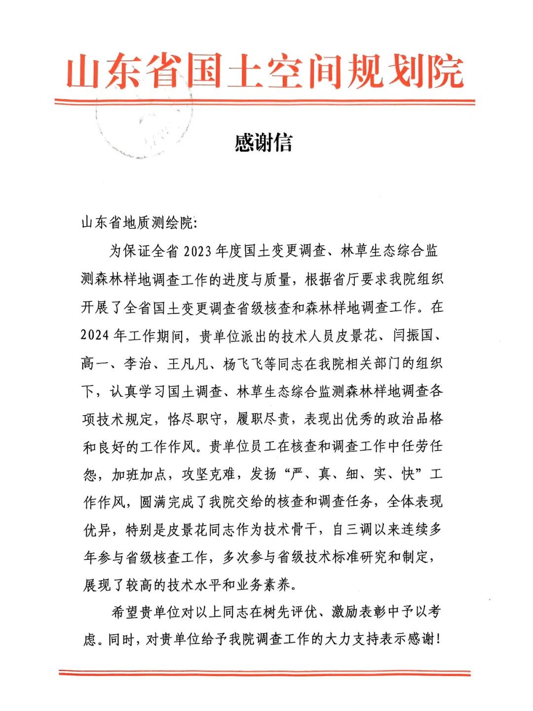 感谢信指出,2024年工作期间,测绘院皮景花、闫振国、高一、李治、王凡凡、杨飞飞等技术人员认真学习国土调查、林草生态综合监测森林样地调查各项技术规定,恪尽职守,履职尽责,任劳任怨,攻坚克难,圆满完成了各项目标任务,树立和巩固了良好的单位形象。