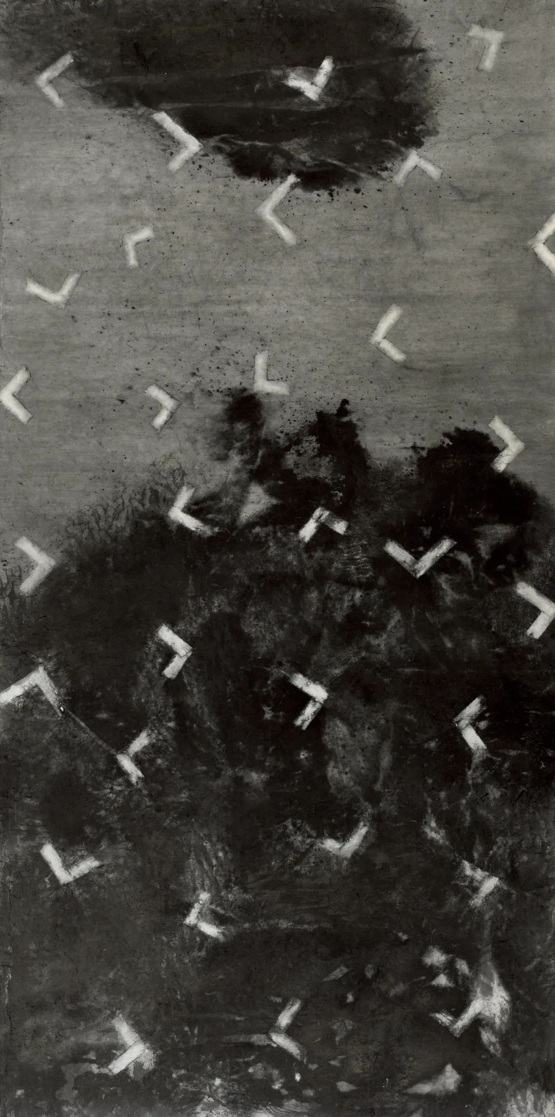 出身于国画世家的松儒尝试水墨材料并探索出一种相当独特而成熟的视觉语言,他笔下的云、山、土地、天空,用水较少,大量采用符号组合和单色铺陈,充满水印木刻的形式趣味。然而,正是这套系统却能塑造不同的地理,展现差异的自然,表达大相径庭的情感。这批作品与他此前的版画有着极强的渊源,不但体现在视觉语言方面,也体现在艺术家一以贯之的个性方面,一望便知是松儒的画。