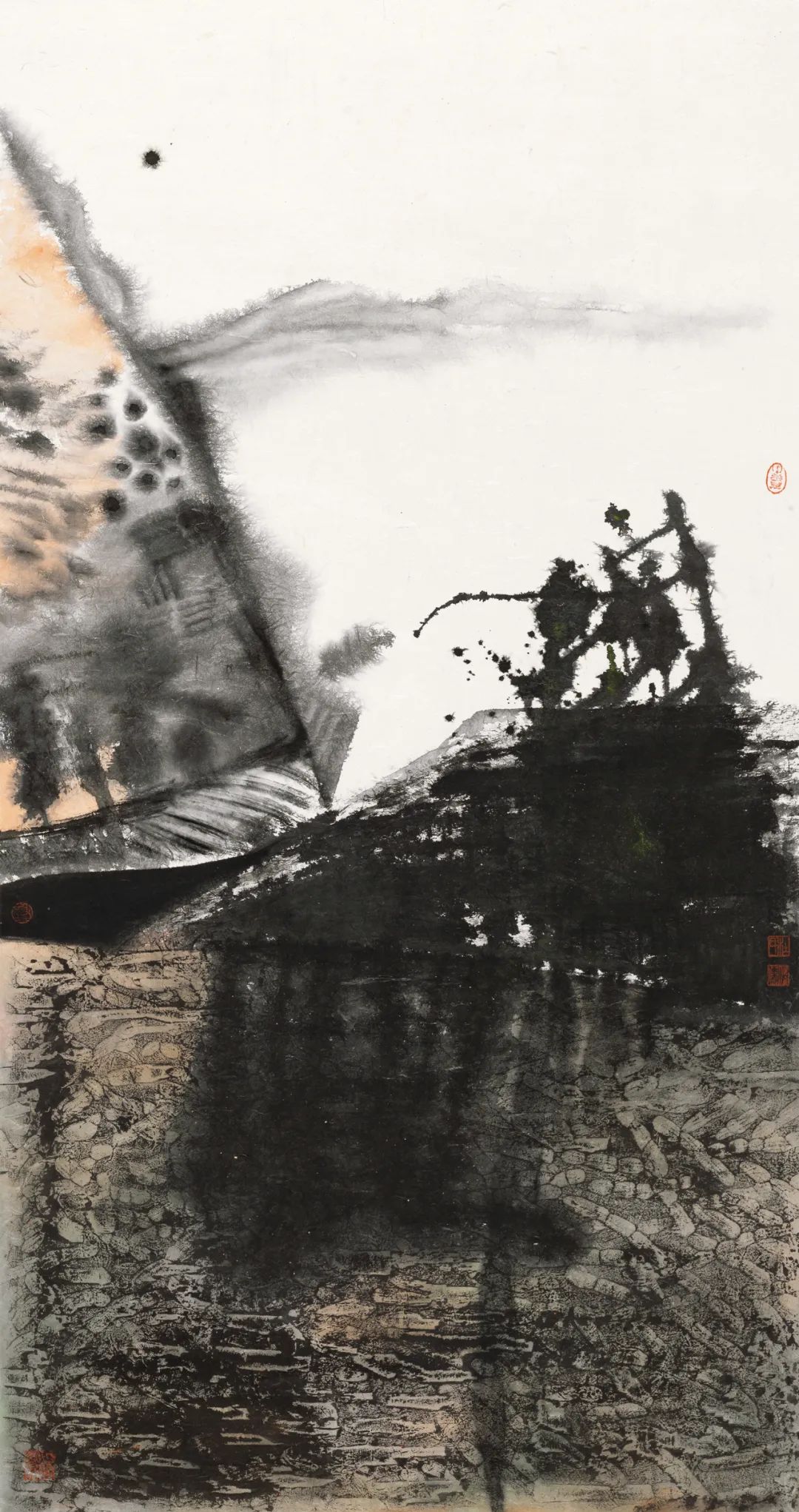 现代版画的主观形式构成以及日本浮世绘版画的平面装饰趣味无疑给杜松儒的水墨画创作带来不少启发。他的水墨山水画创作的灵感源于自然造化,却不拘泥于真实再现自然;他将不同物象的造型简约化、抽象化,以现代构成的方式重新组构点、线与色块,创造出令人耳目一新的现代水墨画的多样化图式。难能可贵的是,他血脉中的民族传统艺术基因使他恋恋不忘中国古代绘画注重意象表现与意境营造的宝贵精髓,在充分发挥水、墨、色的材料特性的同时不因循传统固有的笔墨程式,或以淡墨挥洒烟雨之迷濛,或用浓墨晕染丛林之苍茫,或施花青笼罩远山之青翠,墨色交融、形色组构而成内心的意象与幽深的意境。