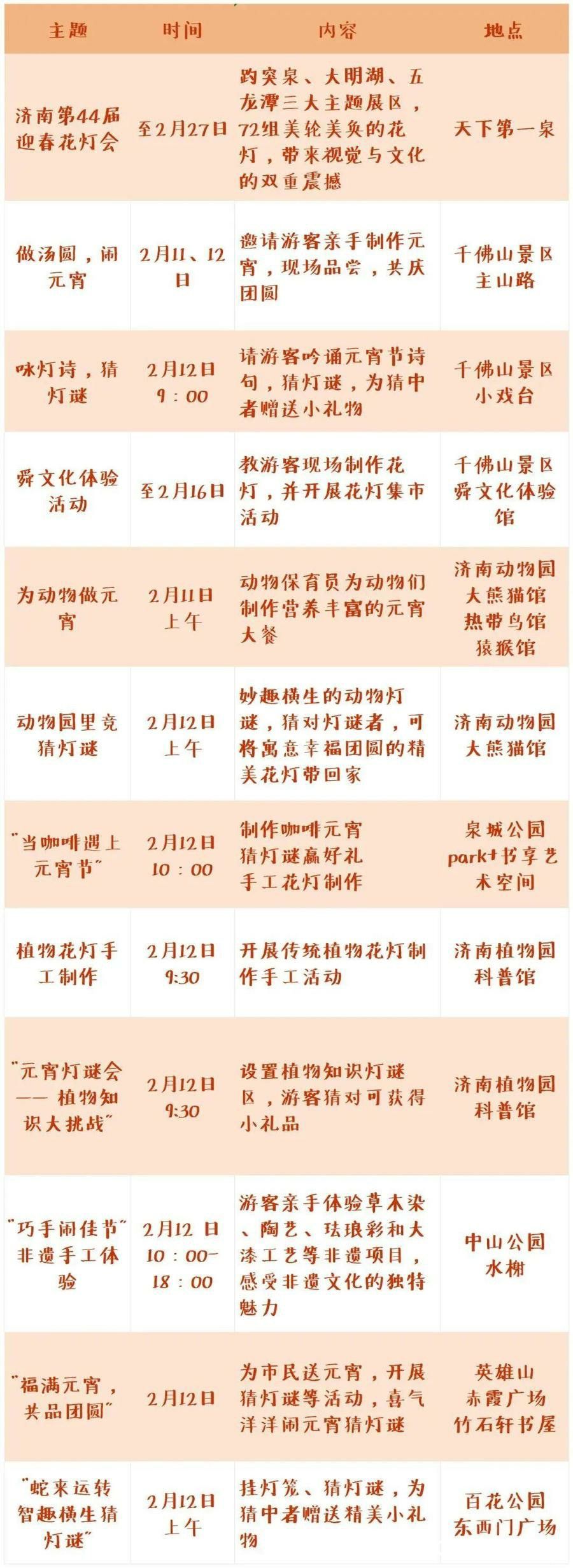 赏花灯、猜灯谜、体验非遗手工……这份济南各大公园元宵节民俗活动表值得你收藏文化视界2025-02-11微信扫码扫码下载客户端2月12日(本周三)就是元宵节啦!自古以来,元宵节便有观花灯、猜灯谜、品元宵的民俗传统,济南市属公园为此早已精心准备了10余场元宵民俗活动,与广大市民游客一起喜乐闹元宵,大狂欢让年味得以精彩延续。济南各市属公园元宵民俗活动一览表(来源:大众新闻) 特别声明:本产品由大众新媒体大平台“大众号”号主上传发布,不代表平台观点和立场。