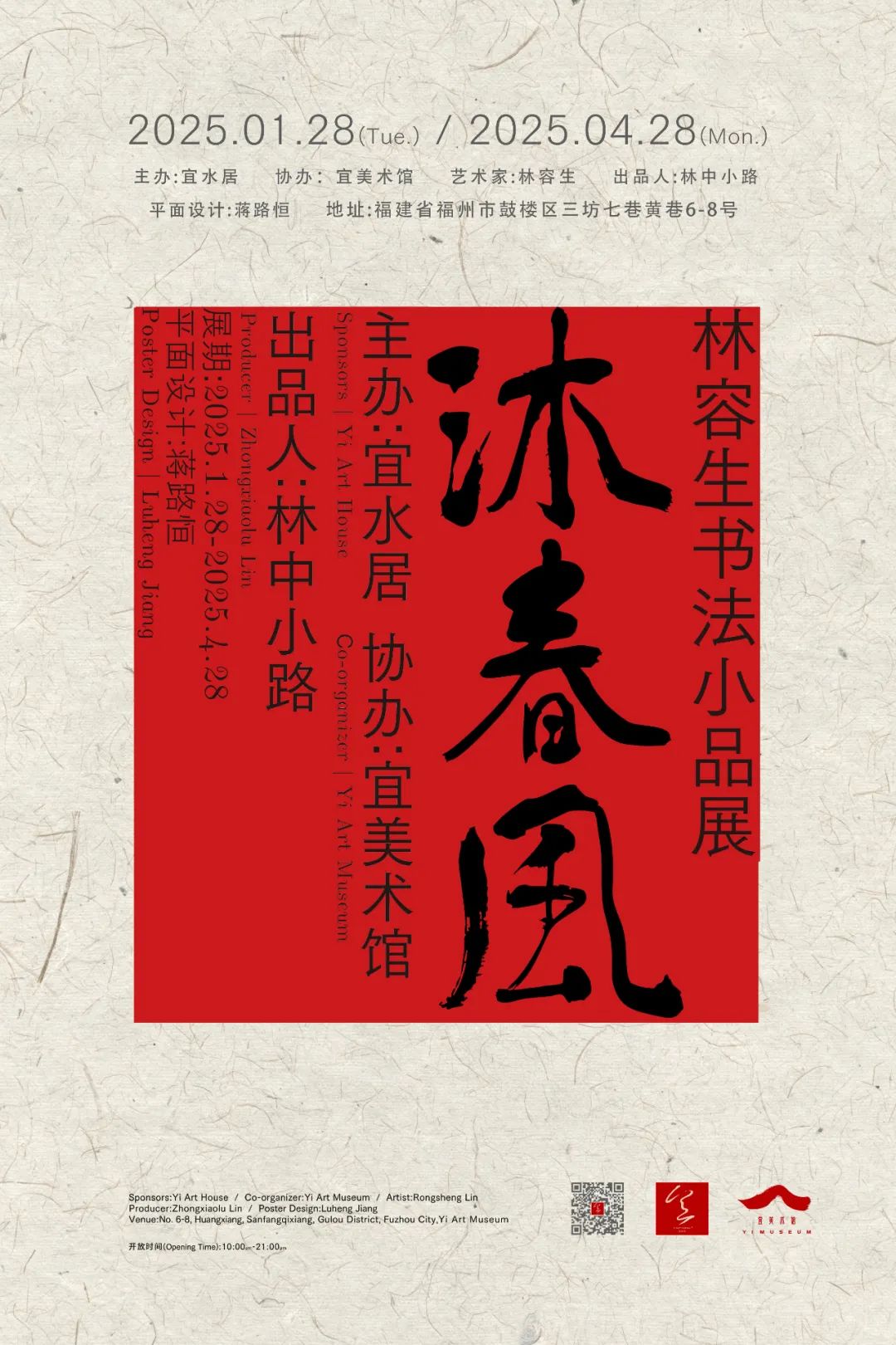 沐 春 风2025 林容生书法小品展Lin Rongsheng Solo Exhibition 2025主办 | 宜水居  Sponsors | Yi Shui Ju协办 |  宜美术馆Co-organizer | Yi Art Museum艺术家 | 林容生Artist |  Rongsheng Lin出品人 |  林中小路Producer | Zhongxiaolu Lin展览时间 |Exhibition 2025.01.28-2025.04.28平面设计|蒋路恒Poster Design |  Luheng Jiang展览地点 | Venue福州市鼓楼区三坊七巷·黄巷6-8号宜美术馆