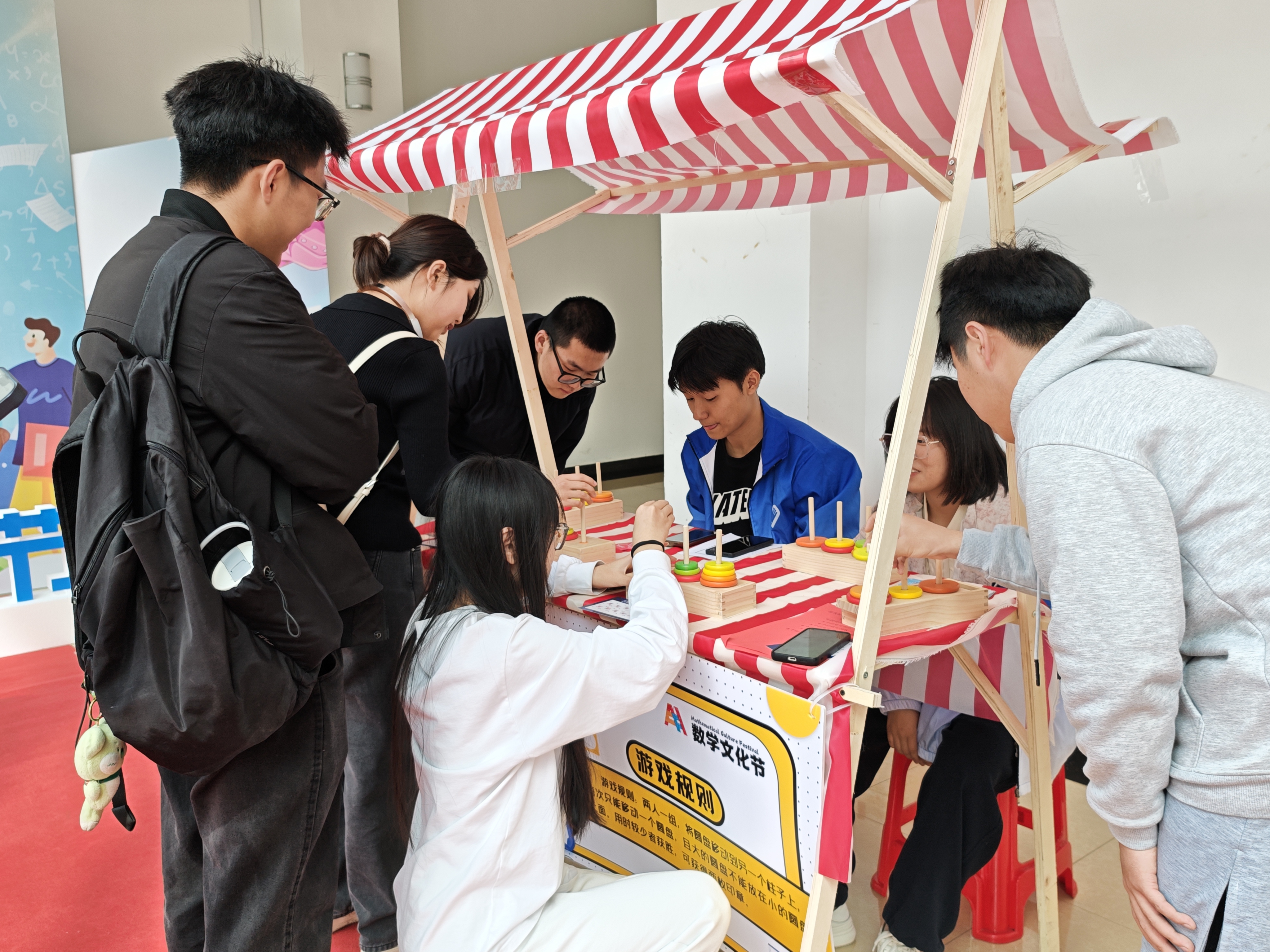 作为本次数学文化节活动之一的数智游戏体验展在艺体中心大厅举办。此次游戏展分为“神奇24点”“一算到底”“数字华容道”“趣味数独”“汉诺塔”“π记忆”“估算外接圆直径”“巴什博弈”“数学里的浪漫三行情诗创作”“AI数学挑战快问快答”10个主题,游戏活动形式多样,充分激发了青年学生的学习热情和研究兴趣。