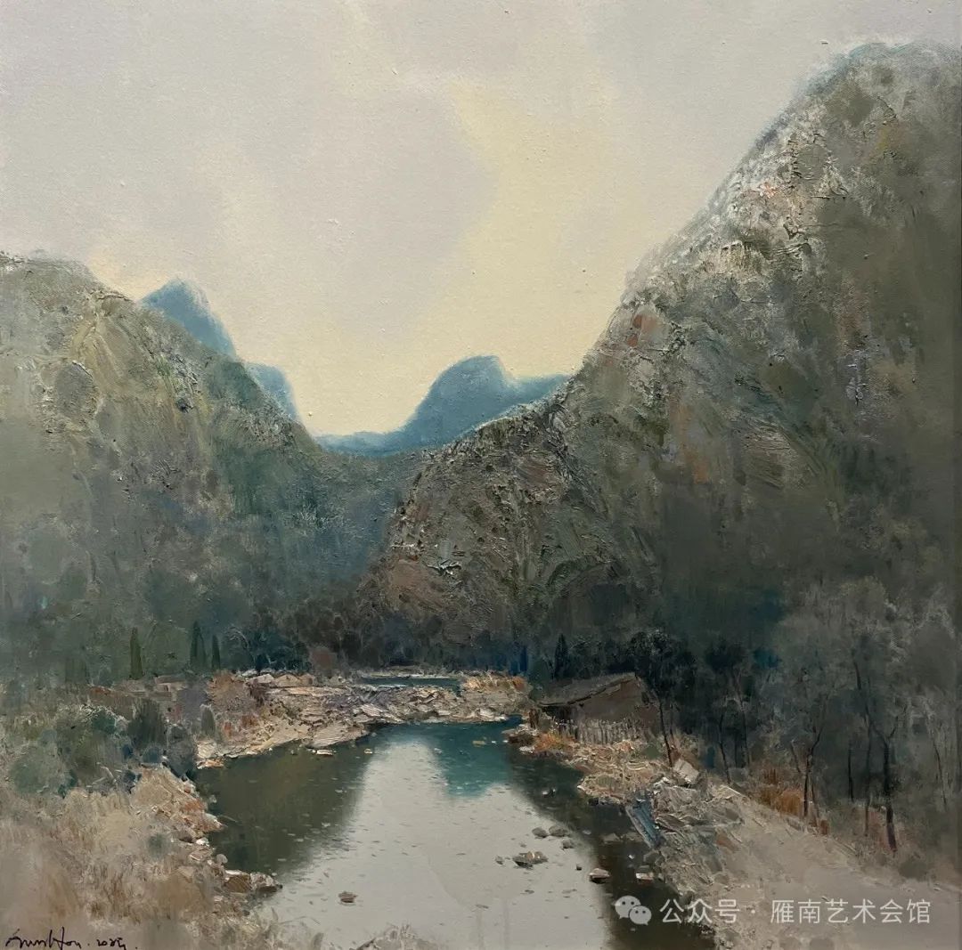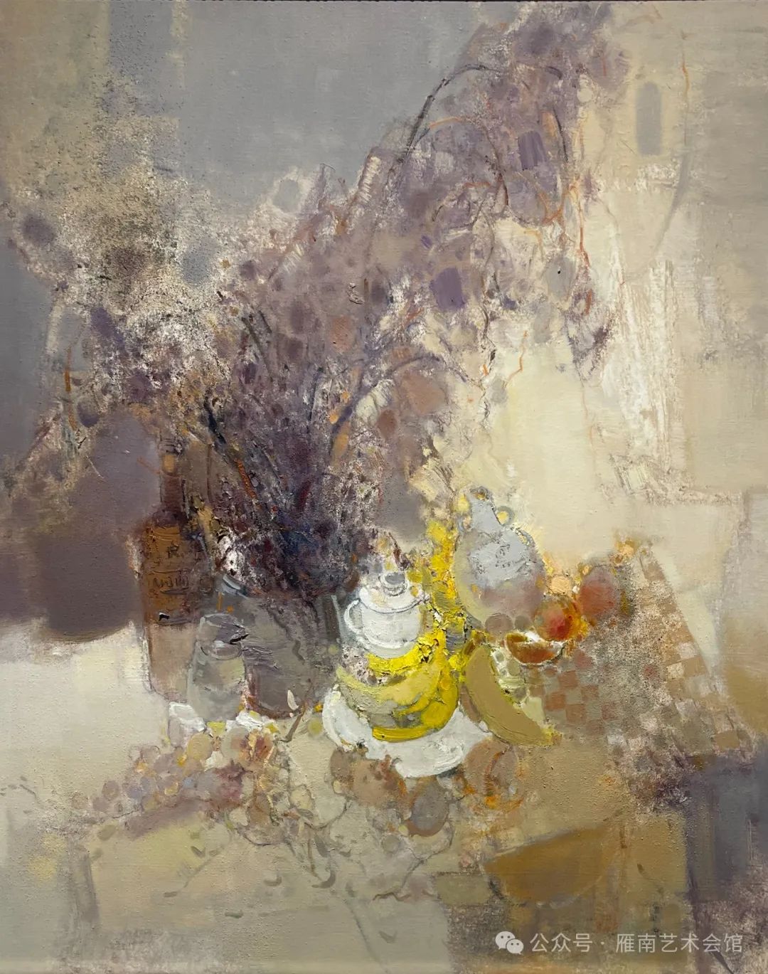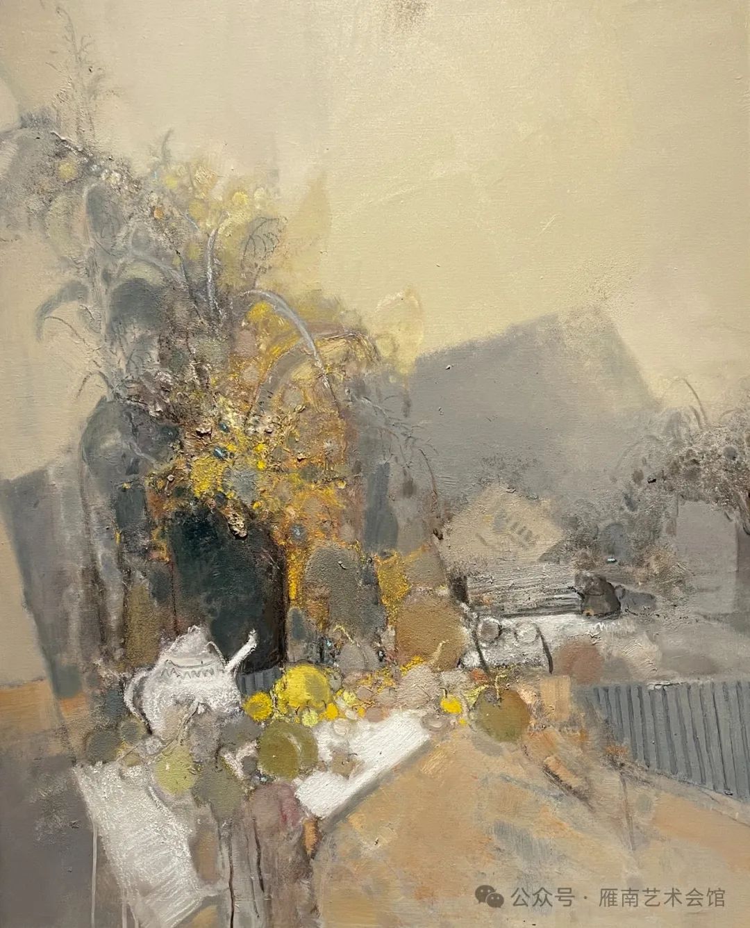 平实的运笔、沉稳的色彩、斑驳的肌理,游刃于精美的造型细节间,质朴与厚重中裹挟着灵巧与含蓄;运动与变化中酝酿着平衡与和谐,如人生酒宴觥筹交错,又如四季白昼枯荣更迭,使画面萦绕着一丝时光荏苒的悠远和苦寒,是对尘世的厌倦?对故乡的思恋?还是对命运的感叹?这一切都是厚兄心灵深处的映射,是久违了的心中之境的再现。