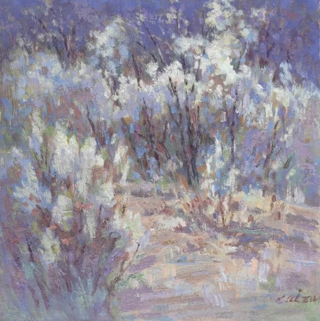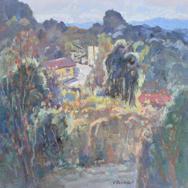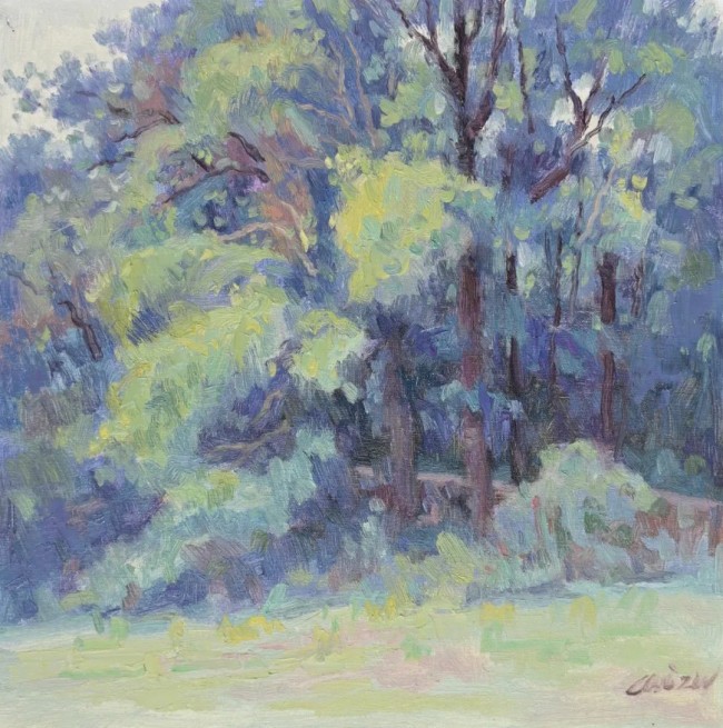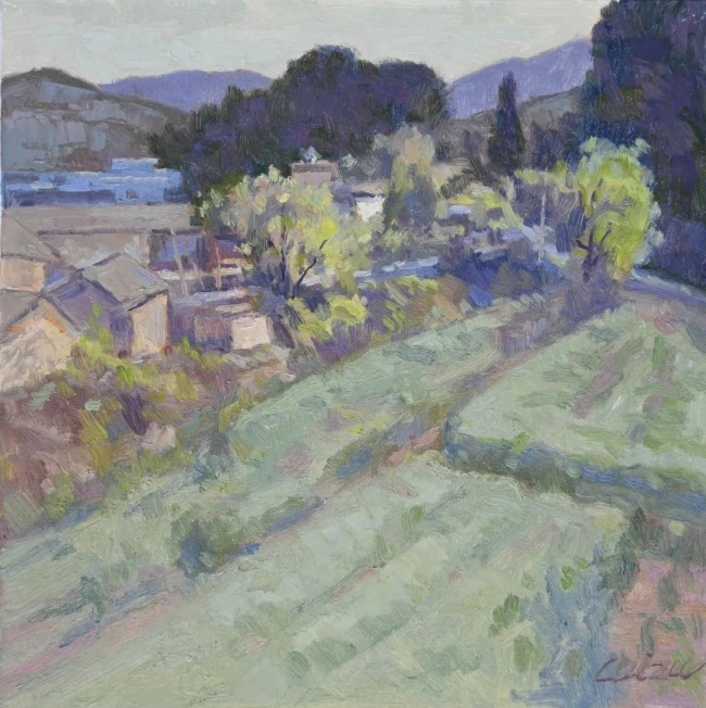 贡布里希曾评价柯罗的画,“似乎以新的手法,用他的一套颜色捕捉到了景色中闪烁的光线和发光的烟雾。他在银灰色的基调内作画,不仅没有完全淹没颜色,反而在不背离真实的情况下保持了颜色的和谐。”拿这一段文字来说老蔡展出的画,简直若合符契。老蔡虽然不是特别善于言谈,就像丽水的“风景”,但他有自己对于艺术的深刻体验和观点。他曾经自我总结道:画家在做审美劳动时,不仅仅是对物体的再现,更不是在炫耀技法,而是在向他人示范新的观察和审美方式。他特别欣赏和肯定柯林武德在《艺术原理》中表述的核心观点,认为真正的艺术都是表现性艺术。他真诚地学习巴比松精神,对写生有着发自内心的热爱,就像巴尔蒂斯所言:“脱离自然的画家会渴死在泉水旁,而写生就是在活水的源泉之地获取新生。”他把这句话看作自己的座右铭。作为丽水巴比松新一代的艺术精神核心和行政事务性领导,老蔡对于绘画的未来发展充满信心,他认为油画艺术应该走出现代主义的神话,向自身的现实回归。现实生活的丰富性是无限的,为我们提供着对事物的新鲜感受,从而去创造更新的形式。我们用自己的眼光去不断观察现实,用自己的个性去体验生命的存在,就人类的整体而言,个性也是无限的。这是多么透彻的领悟,多么坚定的自信。不妨说,这种信心实际上是老蔡以及丽水许多画家仍然能够坚守巴比松精神的另一种表述。