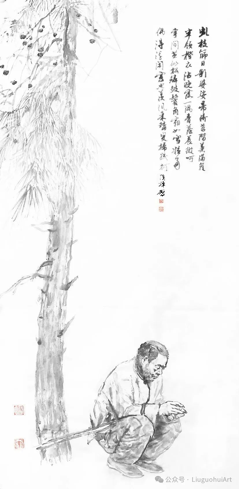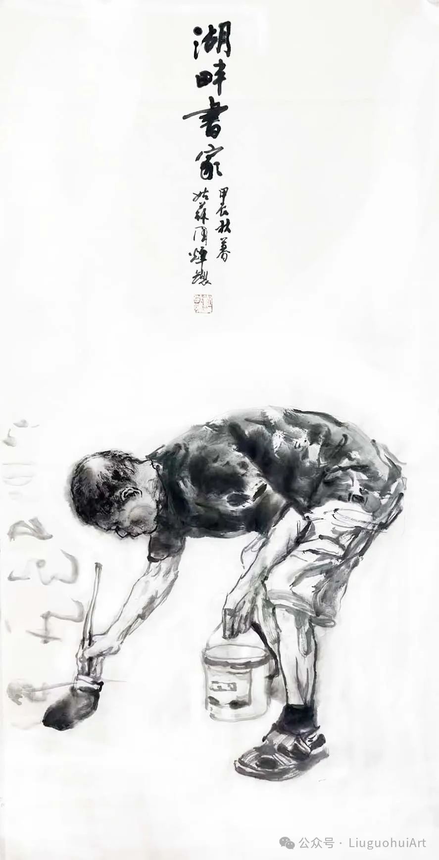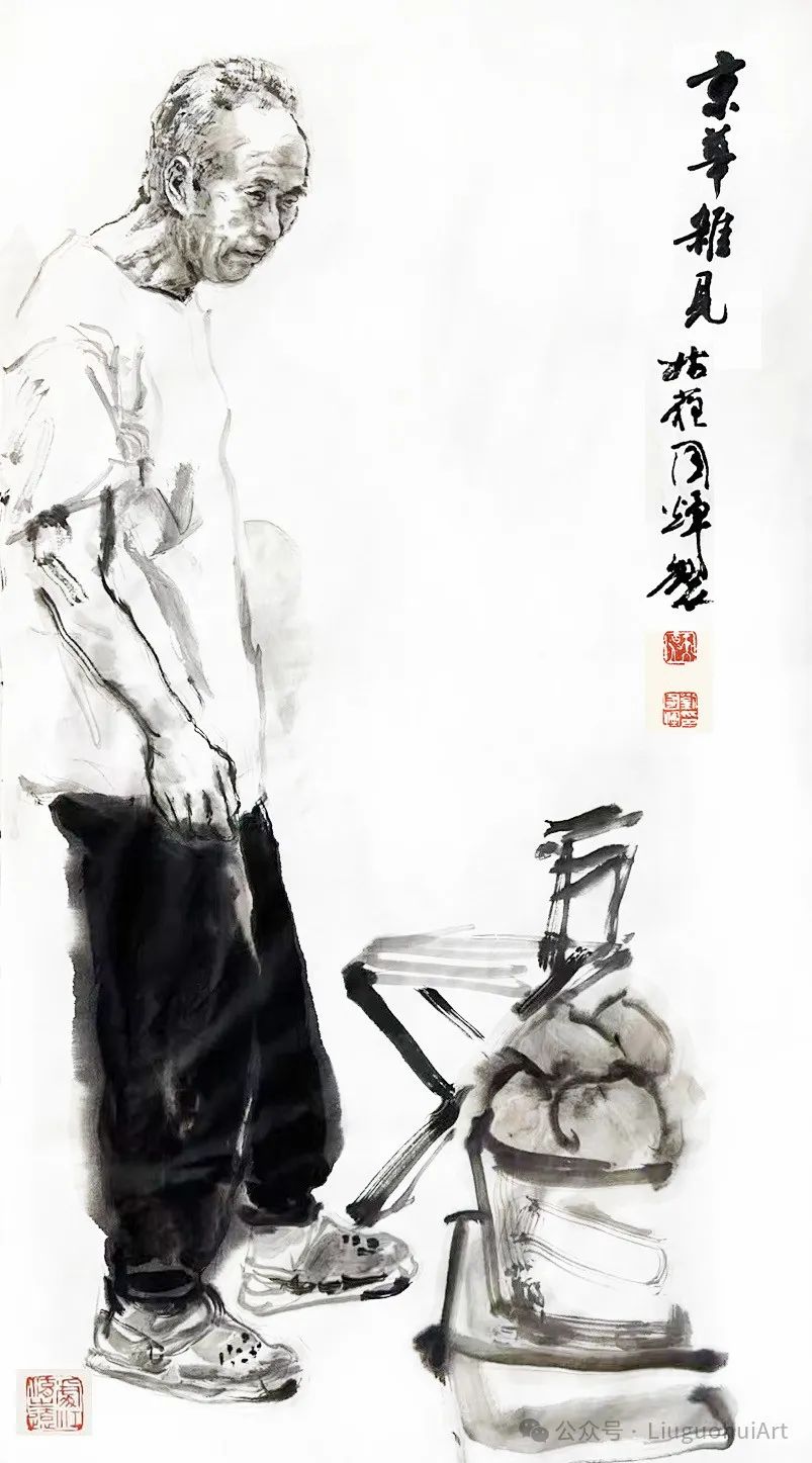 相较于早期作品的严谨写实,刘国辉近作的笔墨呈现出更为自由洒脱的美学特质。他突破传统人物画的勾线范式,采用“拖泥带水”的皴擦技法,以饱含水分的毛笔在宣纸上快速游走,使线条在干湿浓淡的变化中自然形成肌理效果。这种技法既保留了浙派人物画的书写性,又融入了山水画的写意精神,使人物形象在似与不似之间获得独特的审美张力。枯笔飞白与湿墨晕染的对比,产生强烈的动态韵律,仿佛能感受到画面中人物的呼吸与生活的流动。