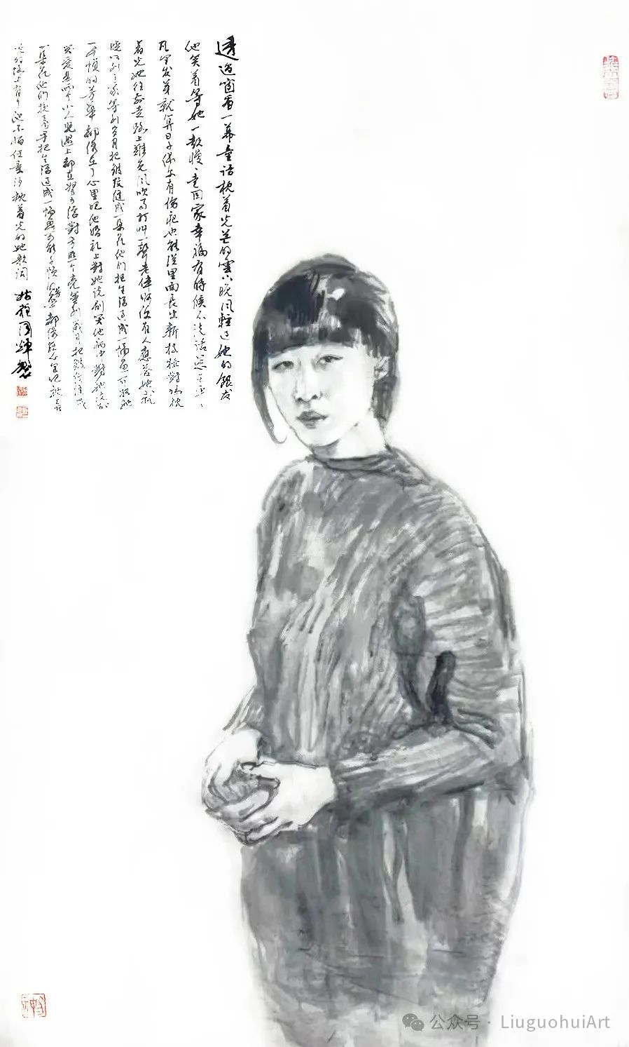 在女性题材的处理上,刘国辉突破了传统仕女画的程式化表现。他塑造的女性形象既有江南水乡的温婉气质,又透露出新时代女性的独立精神。通过流畅的线条与细腻的墨色,他勾勒出职业女性的干练与生活的烟火气息,使这些形象成为当代中国社会变迁的视觉见证。这种“刚柔相济”的塑造手法,体现了他对人性复杂性的深刻洞察。