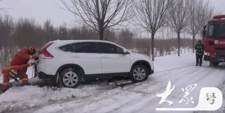 消防救援人员随即下车帮助车主推车,由于天气寒冷轿车上两名妇女已经冻得瑟瑟发抖,消防员先将她们安顿在消防车上取暖,然后利用消防车上牵引工具成功帮助被困车辆脱困,脱困后轿车司机对消防员表达了感谢。