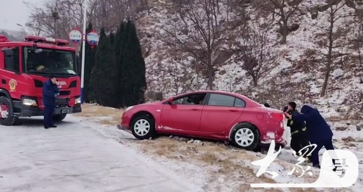 2月21日,烟台市消防救援支队海阳大队在出警归队途中发现,一辆轿车因雪天打滑陷入水沟抛锚。