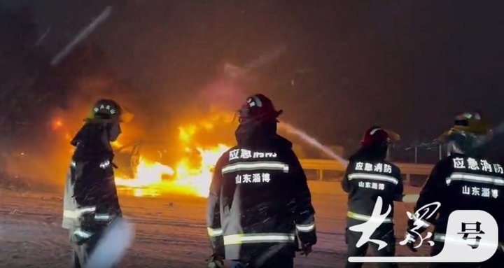 2月20日,山东省淄博市消防救援支队接到报警,因天降大雪,淄博市文昌湖区滨莱高速水磨头村由南往北方向3辆车不慎先后发生碰撞致2辆车辆自燃引发火灾,车内受伤人员已被现场民警救出及时送往医院救助。接警后,淄博市消防救援支队立即组织救援力量赶赴现场。