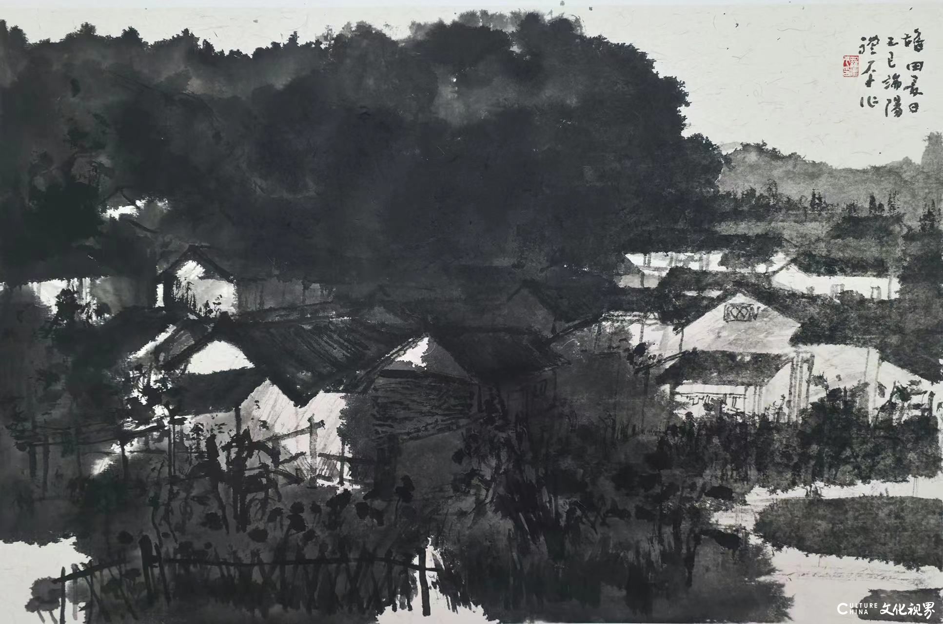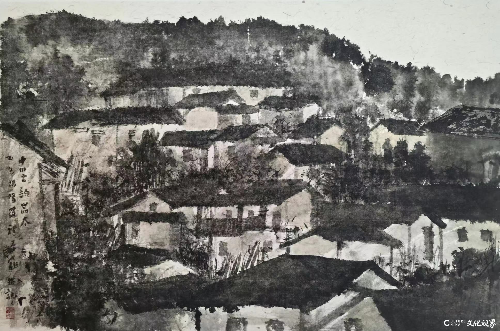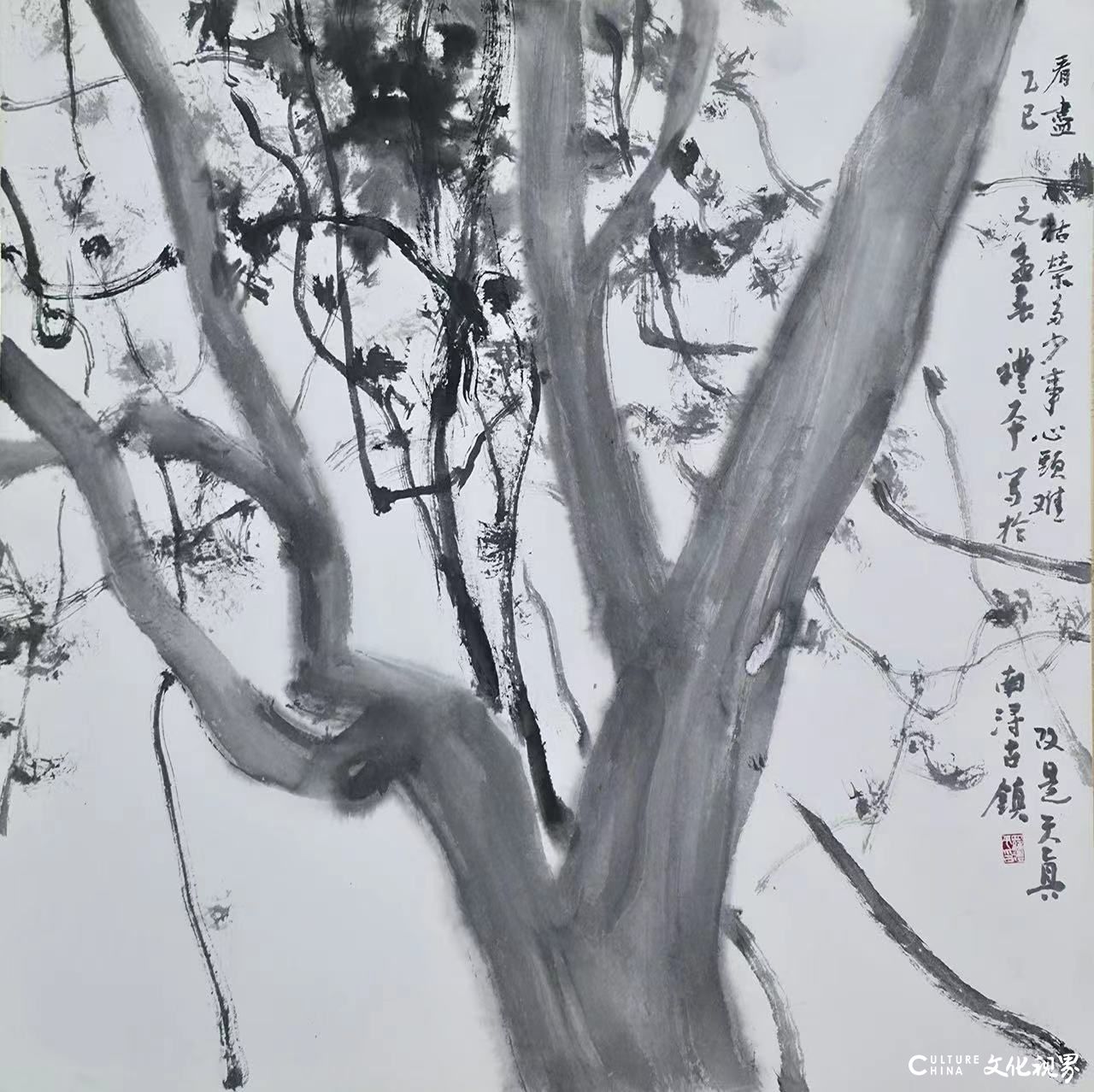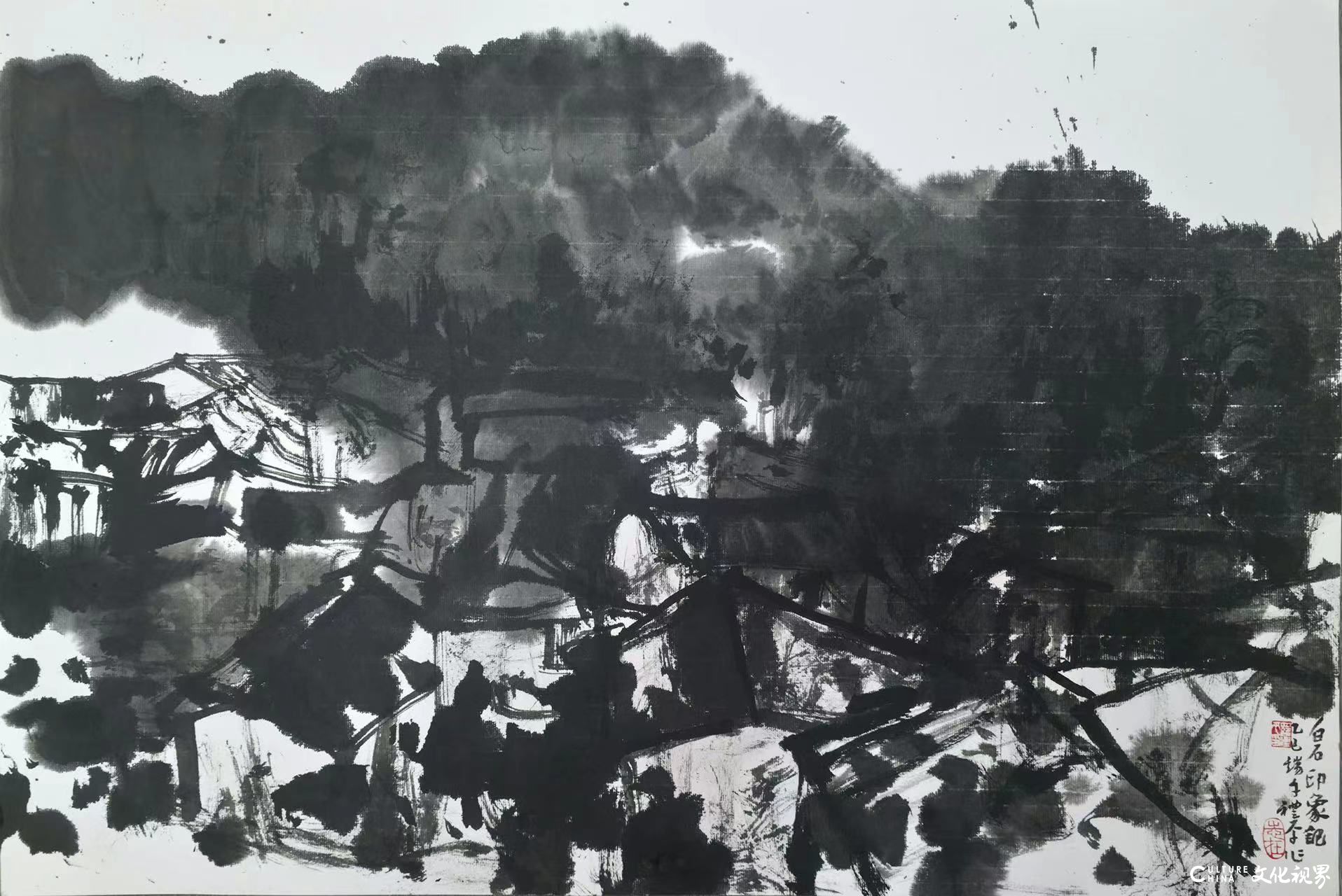罗礼平的山水画展现出对传统笔墨程式的创造性转化。他深谙古人"以书入画"的要义,笔下的线条既有书法用笔的韵律感,又具备塑造山石肌理的表现力。那些看似随意的皴擦点染,实则蕴含着严格的法度与秩序。艺术家善于运用干湿浓淡的墨色变化,在有限的灰度中创造出丰富的层次感。特别是他对"飞白"效果的运用,既保留了传统笔法的书写性,又赋予画面以现代的抽象意味。这种对笔墨语言的精研与拓展,使他的作品在传统与现代之间架起了一座无形的桥梁。