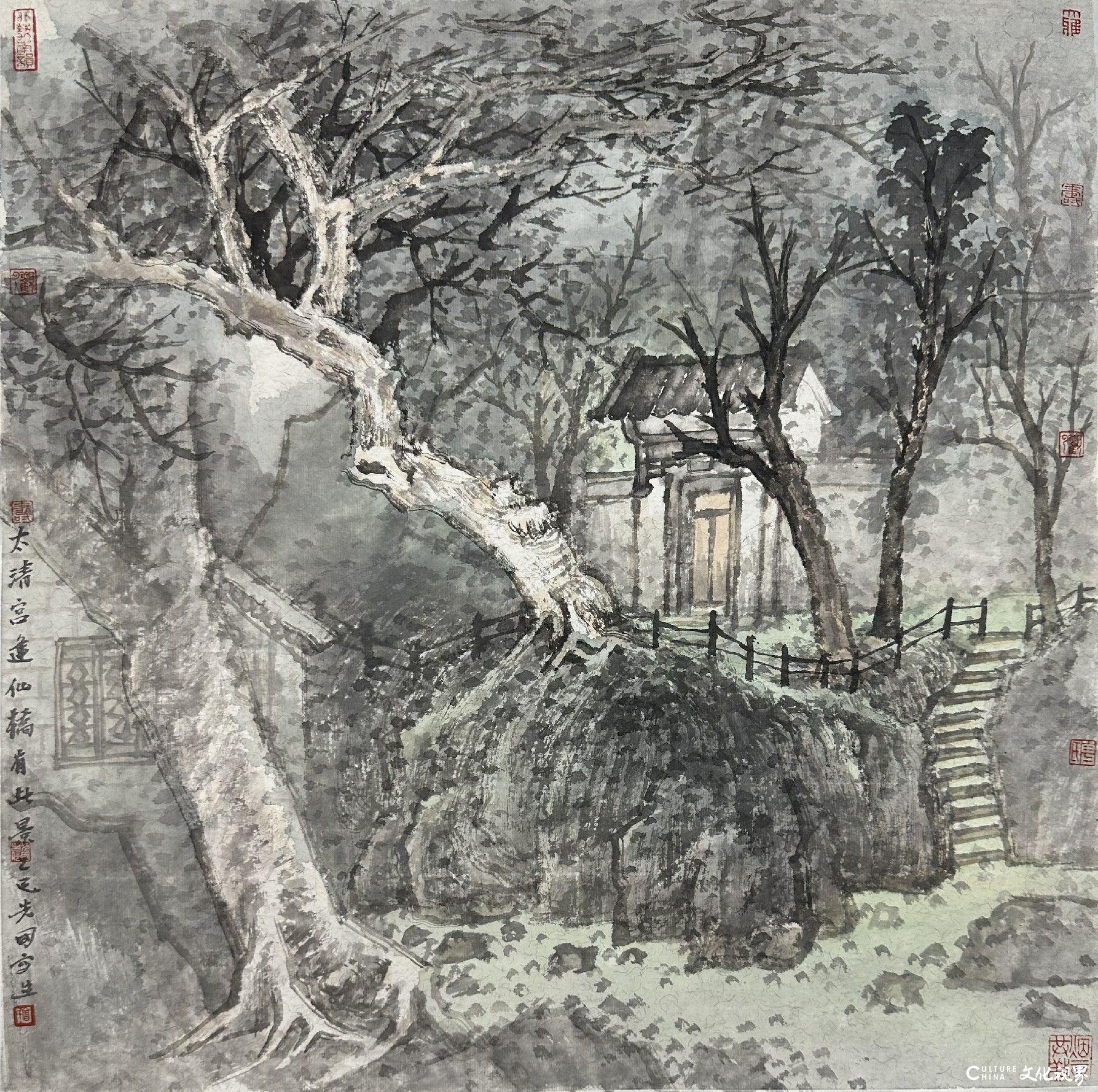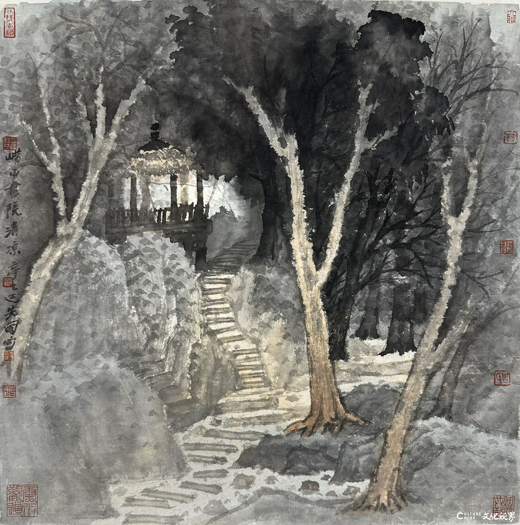与此同时,他的创作承载着鲜明的地域文化记忆。作为青岛画派的领军人物,他将“海岱心境”的艺术理念融入崂山题材,使山海交汇的地理特征与海洋文化的开放精神成为画面的隐性叙事。那些隐现于山间的道观飞檐、缠绕古木的藤蔓、穿透云层的光束,既是地域历史的视觉注脚,也是城市文化记忆的集体投射。这种将个人创作与地域文化相联结的实践,使崂山写生超越了个体风格的范畴,成为当代山东美术乃至中国北方山水的文化标识。