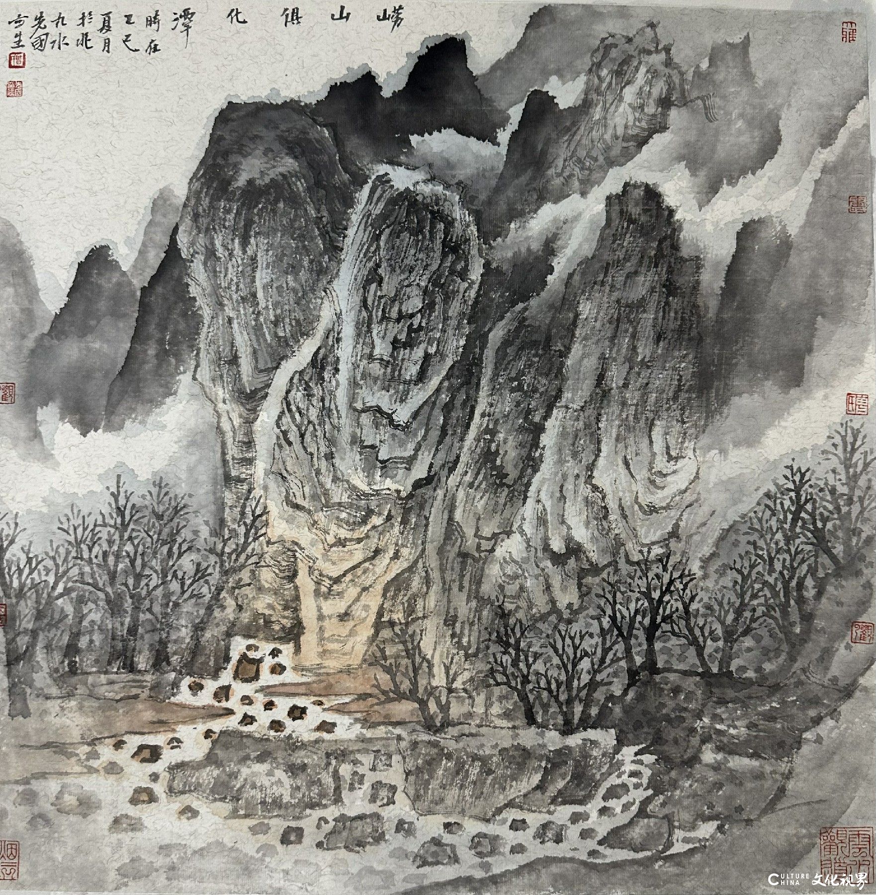 曾先国的艺术语言,呈现出“北骨南风”的美学融合特质。作为生长于北方的艺术家,他深研北宋山水“高山大壑”的雄浑气象,以苍劲的笔线勾勒崂山山体的骨架;同时又在江南画派的氤氲水墨中汲取养分,以淡墨烘染与留白技法营造山海间的气韵流动。这种融合并非简单的技法叠加,而是源于他对地域文化精神的深刻体悟——齐鲁文化的刚健与江南文化的温润,在他的笔墨中转化为“干裂秋风,润含春雨”的美学张力。