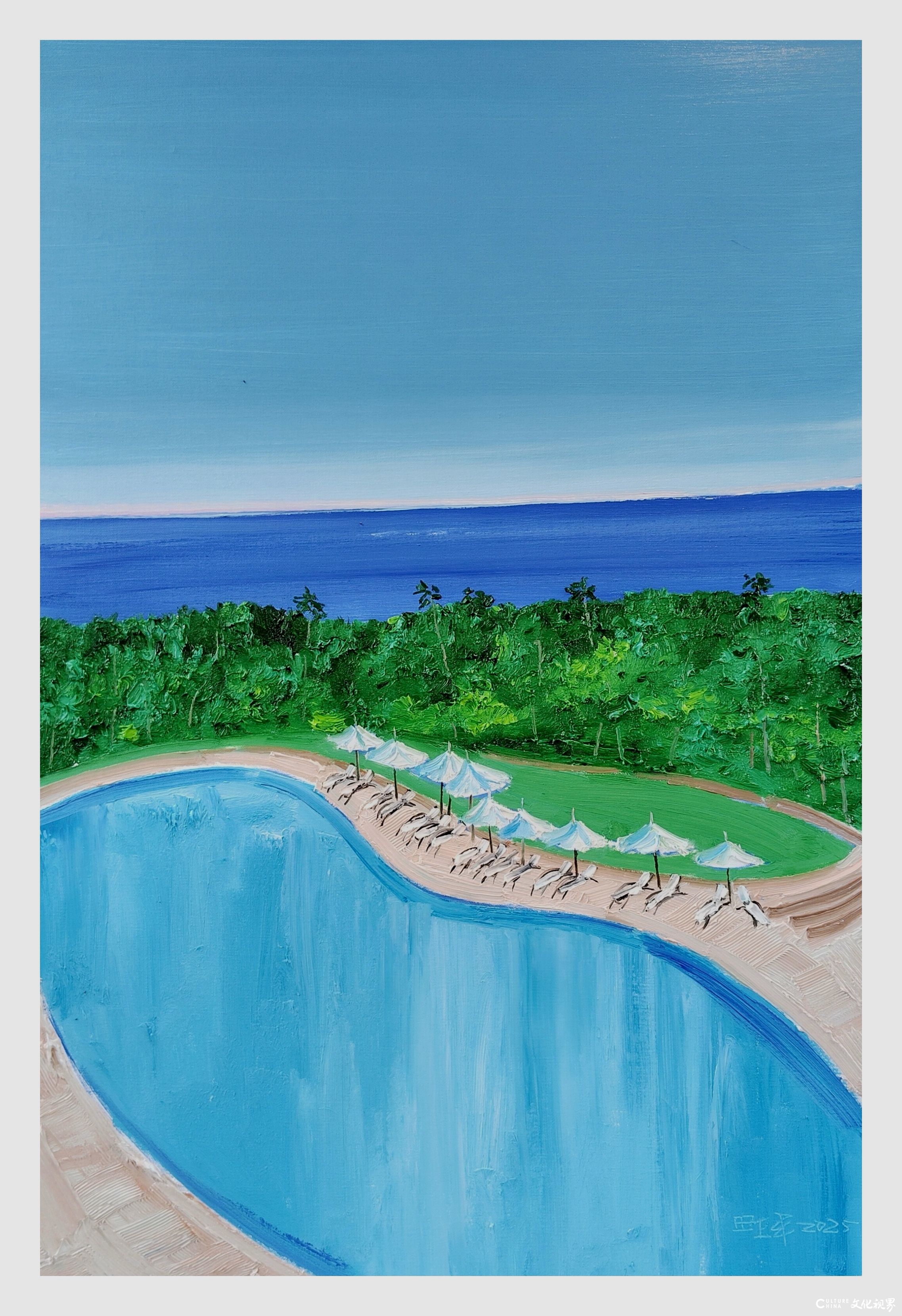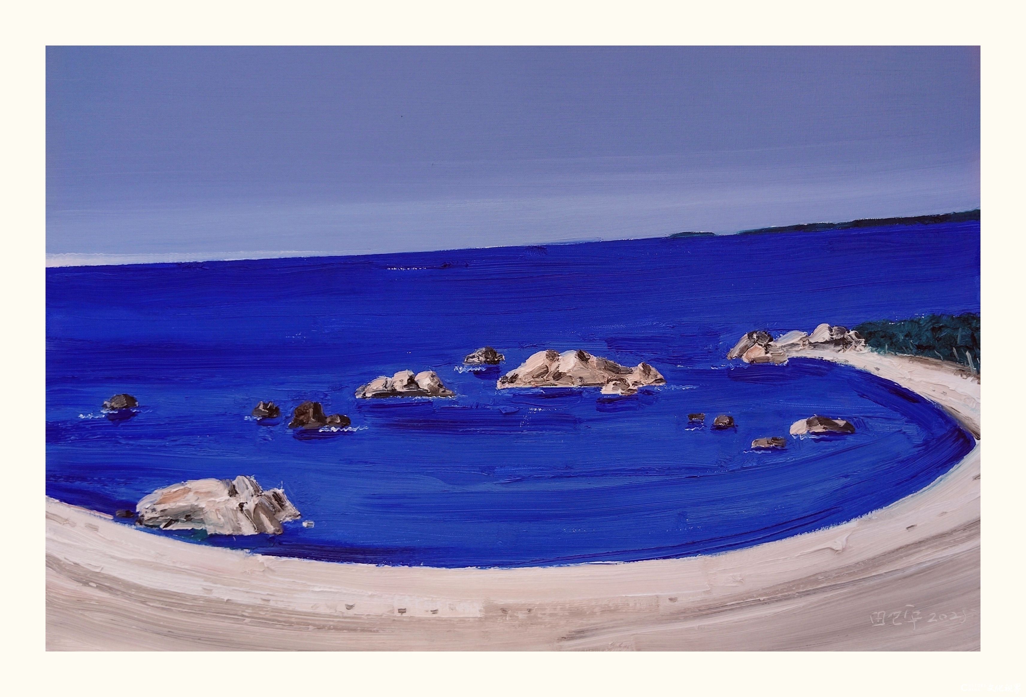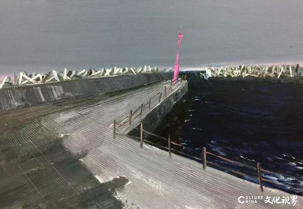 色彩运用上,田卫平突破了传统风景画的自然主义局限,建立起极具个人辨识度的色谱体系。他常以高明度的钴蓝与赭石构成画面基调,通过冷暖色块的交响对比营造空间韵律。特别值得注意的是其对白色的创造性运用——不是作为简单的留白或高光,而是转化为具有物质感的视觉元素,在画面上形成类似中国画"计白当黑"的美学效果。这种经过提炼的色彩语言既保留了油画的厚重质感,又呈现出水墨般的通透性,使画面产生"色墨相生"的独特韵味。